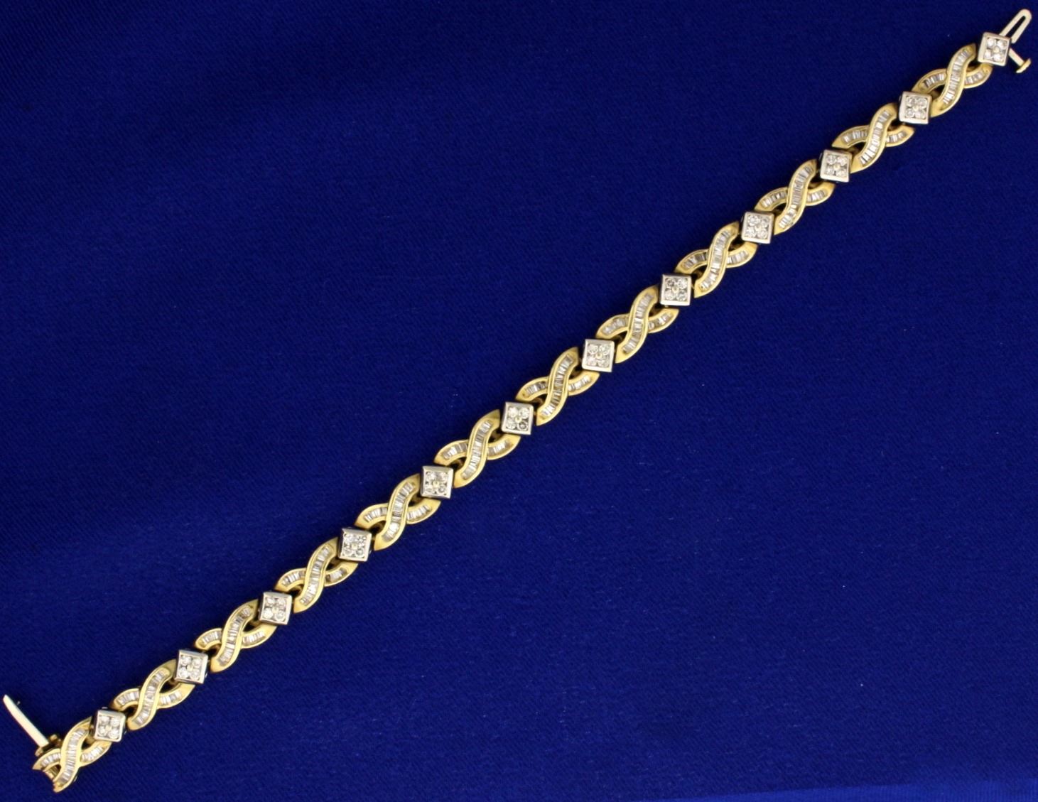 In 14k yellow and white gold. Contains 1/2 ct TW of high quality round brilliant diamonds, VS clarity/H color. Also contains 2 1/2 cts of baguette diamonds of similar high quality. 6.4mm wide. 7 inches long. With safety clasp. 17.2g.