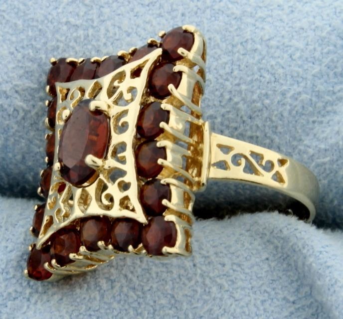 In this 10K yellow gold ring, the center stone is 1ct oval shaped garnet surrounded by eighteen .10ct to .12 ct round garnet gemstones. Size 7 1/2 4.0g