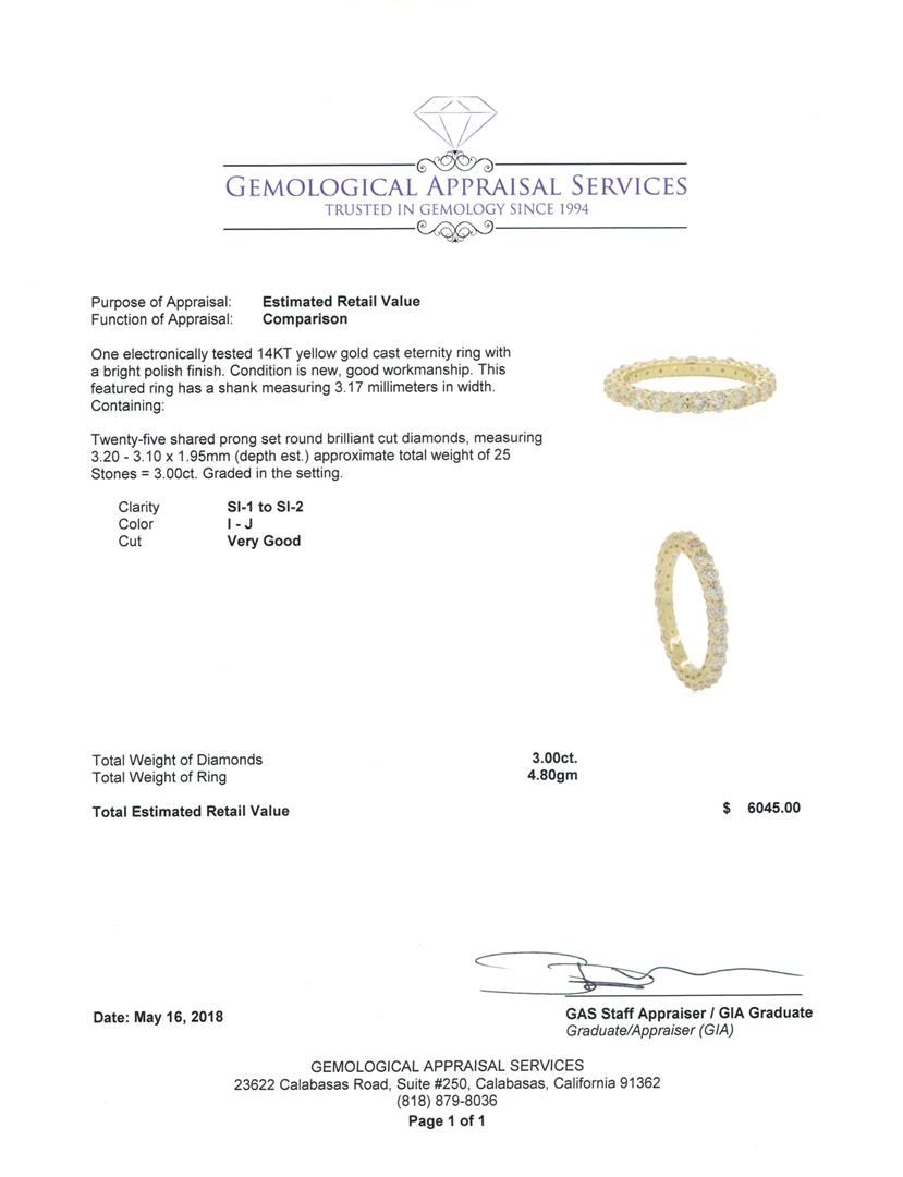 One electronically tested 14KT yellow gold cast eternity ring with a bright polish finish. This featured ring has a shank measuring 3.17 millimeters in width. Condition is new, good workmanship. Containing: Twenty-Five shared prong set round brilliant cut diamonds, measuring 3.20 - 3.10 x 1.95mm (depth est.) approximate total weight of 25 Stones = 3.00ct. Graded in the setting. Color I - J Clarity SI-1 to SI-2 Cut Very Good. Total Weight of Diamonds 3.00ct.. Total Weight of Ring 4.80gm GAS Appraised at  $6045.00. GAS Appraised.