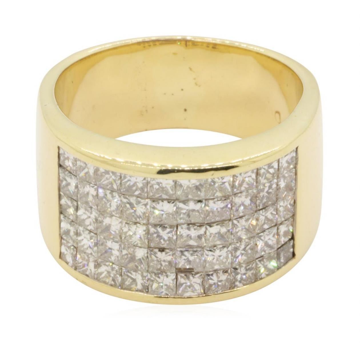 One electronically tested 14KT yellow gold lady's cast fashion ring with a five row wide band with a bright polish finish. This featured lady's ring has a shank measuring 8.60 millimeters in width. Condition is new, good workmanship. Containing: Fifty invisible set princess cut diamonds, measuring 2.20 x 2.00 x 1.50mm (depth est.) approximate total weight of 50 Stones = 3.00ct. Graded in the setting. Color H - I Clarity SI-1 to SI-2 Cut Good. Total Weight of Diamonds 3.00ct.. Total Weight of Ring 13.60gm GAS Appraised at $6710.00. GAS Appraised.