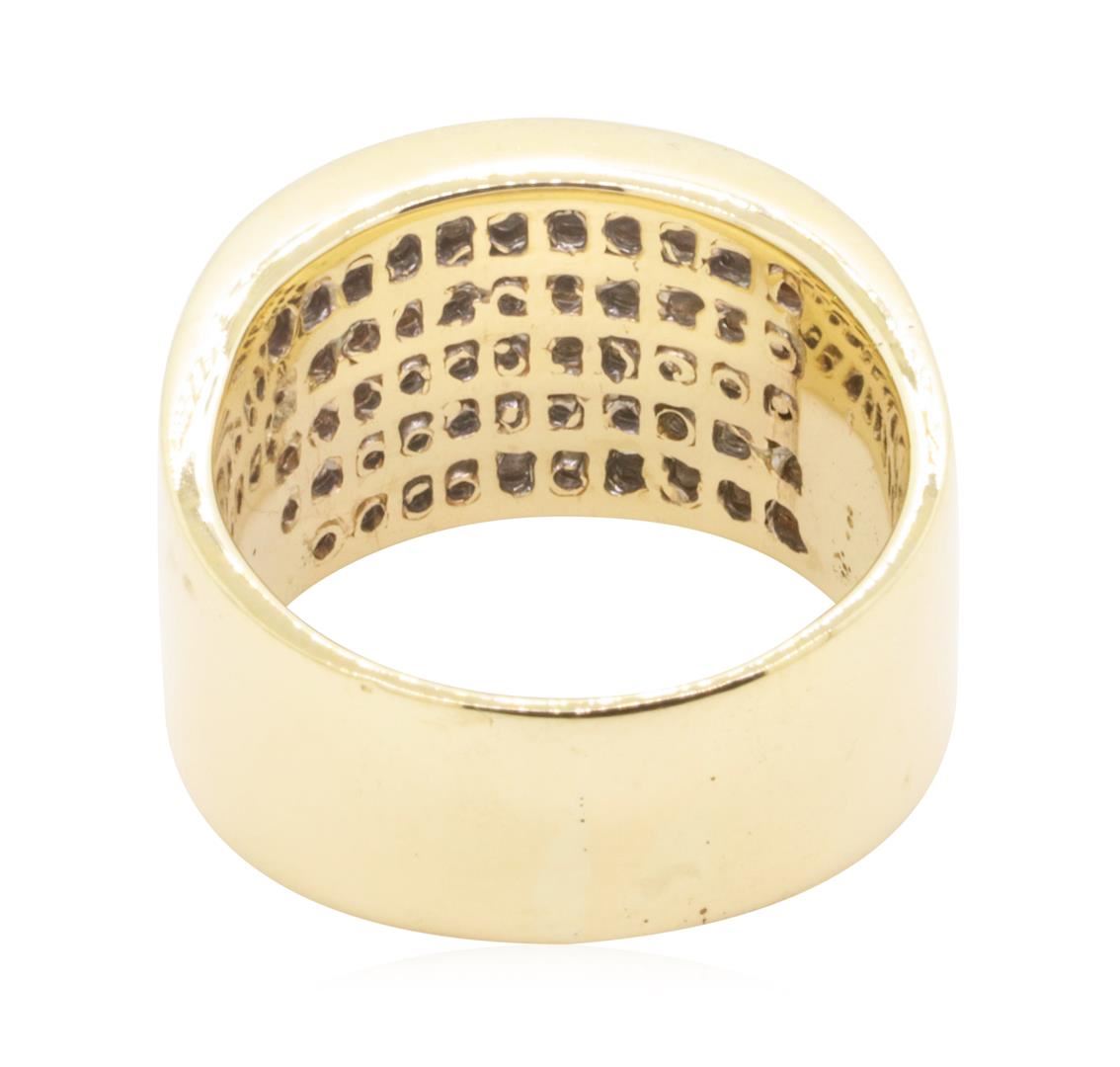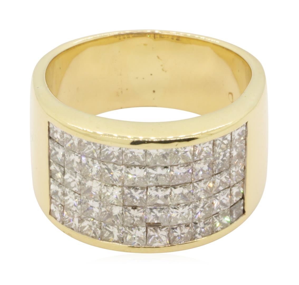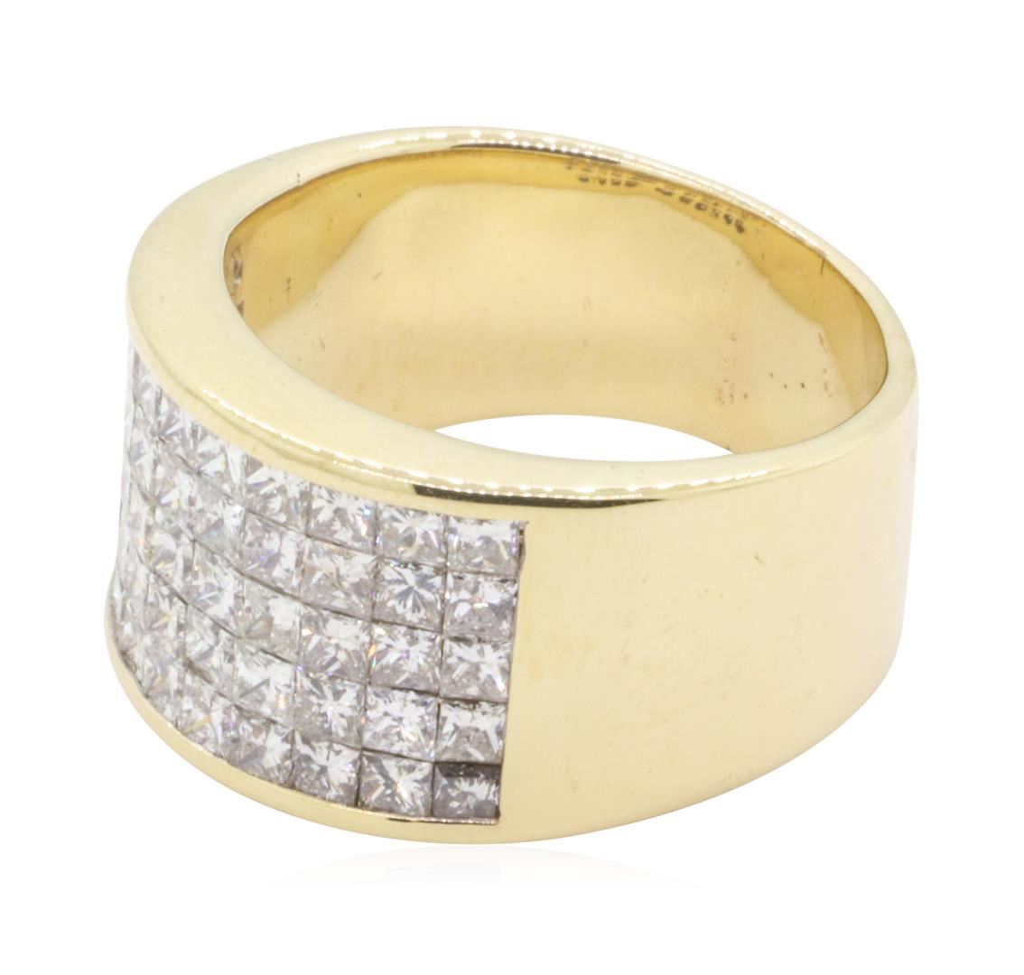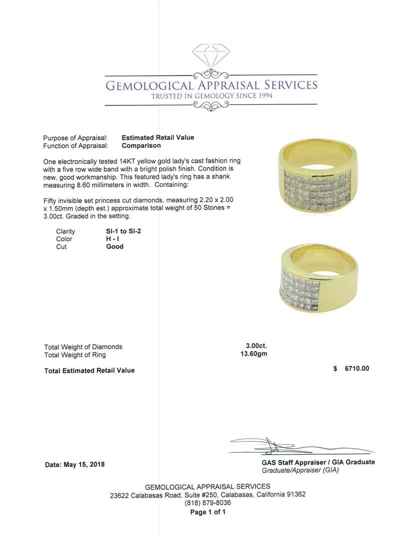One electronically tested 14KT yellow gold lady's cast fashion ring with a five row wide band with a bright polish finish. This featured lady's ring has a shank measuring 8.60 millimeters in width. Condition is new, good workmanship. Containing: Fifty invisible set princess cut diamonds, measuring 2.20 x 2.00 x 1.50mm (depth est.) approximate total weight of 50 Stones = 3.00ct. Graded in the setting. Color H - I Clarity SI-1 to SI-2 Cut Good. Total Weight of Diamonds 3.00ct.. Total Weight of Ring 13.60gm GAS Appraised at $6710.00. GAS Appraised.