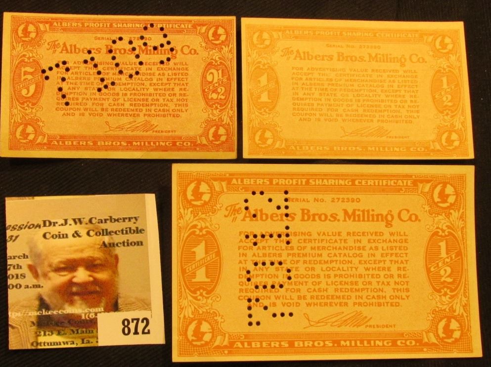 (3) different "Albers Profit Sharing Certificates" from Albers Bros. Milling Co. Tow of the three pieces are hole cancelled. 'Doc' believed they were issued in San Francisco, California.