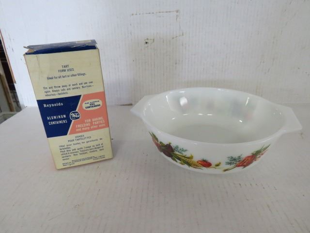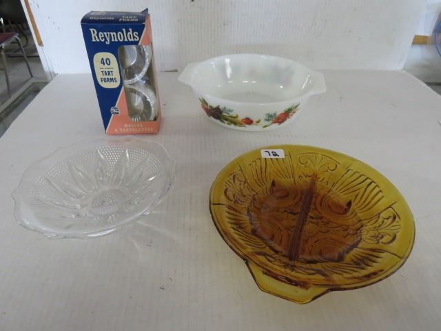 3 dishes, 2 bowls, 1 pickle dish, 1 vintage package of Reynolds Tart Forms