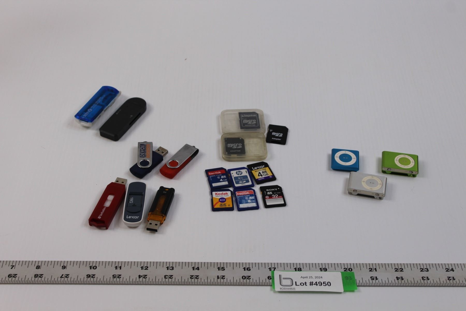 (3) iPod Nanos, (6) SD Cards of Various Sizes (2,4,8 & 32GB), (3) SD Adapters, (5) Flash/Thumb Drives & (2) Card Readers