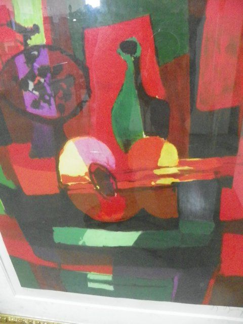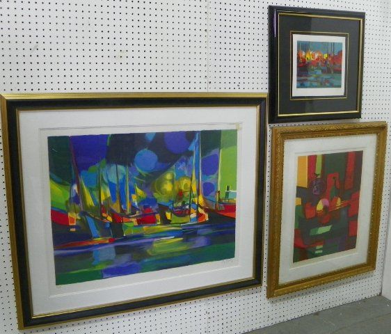 1-9" x 11" image "Seaport" black framed, 1-22.5" x 18" image "Abstract with Guitar" gold framed, 1-33" x 23" image "Sailboats in Dock" black & gold frame. Please read our terms of sale.