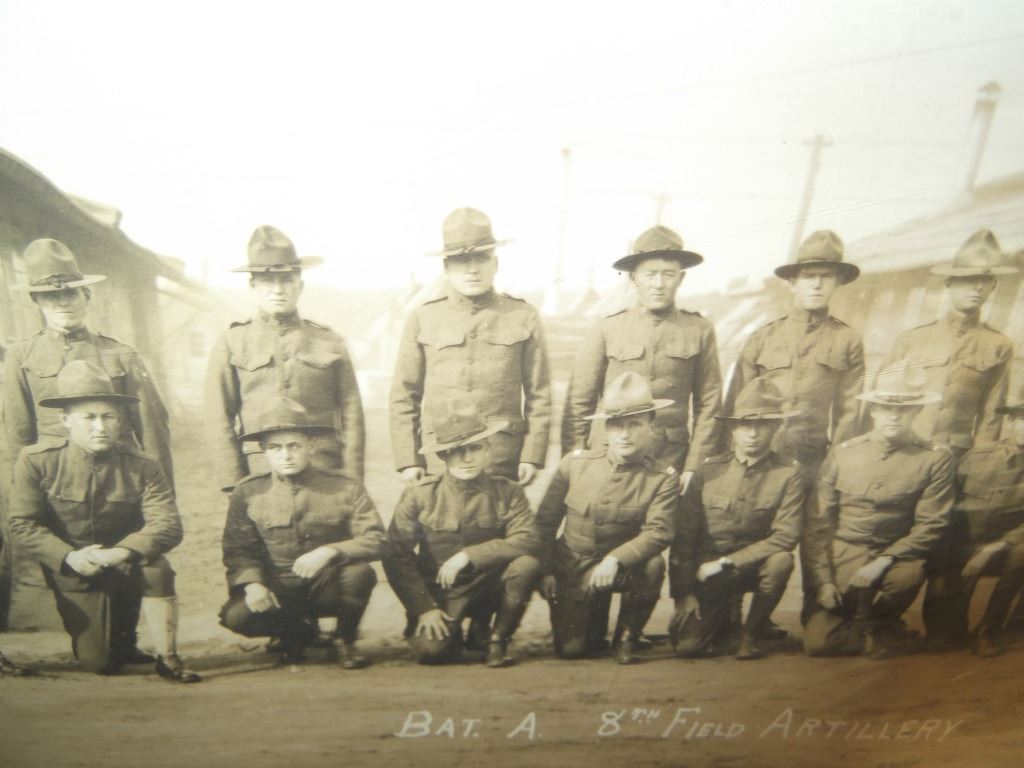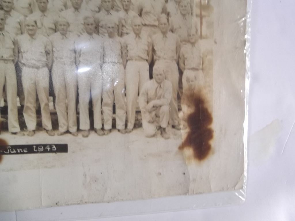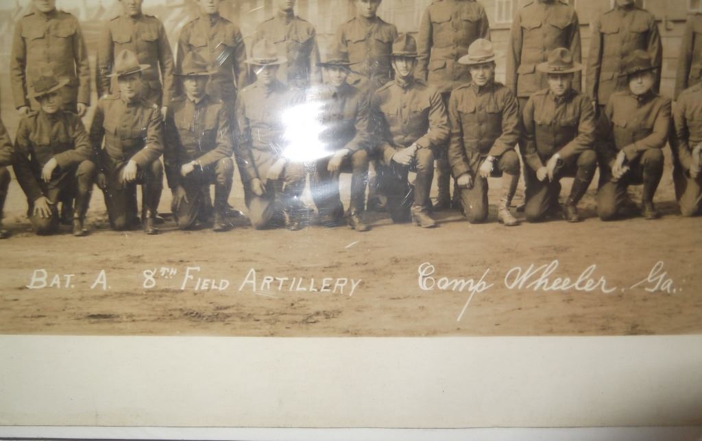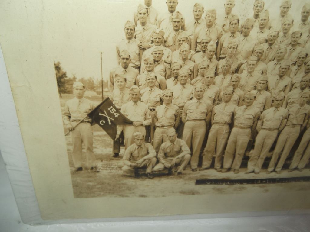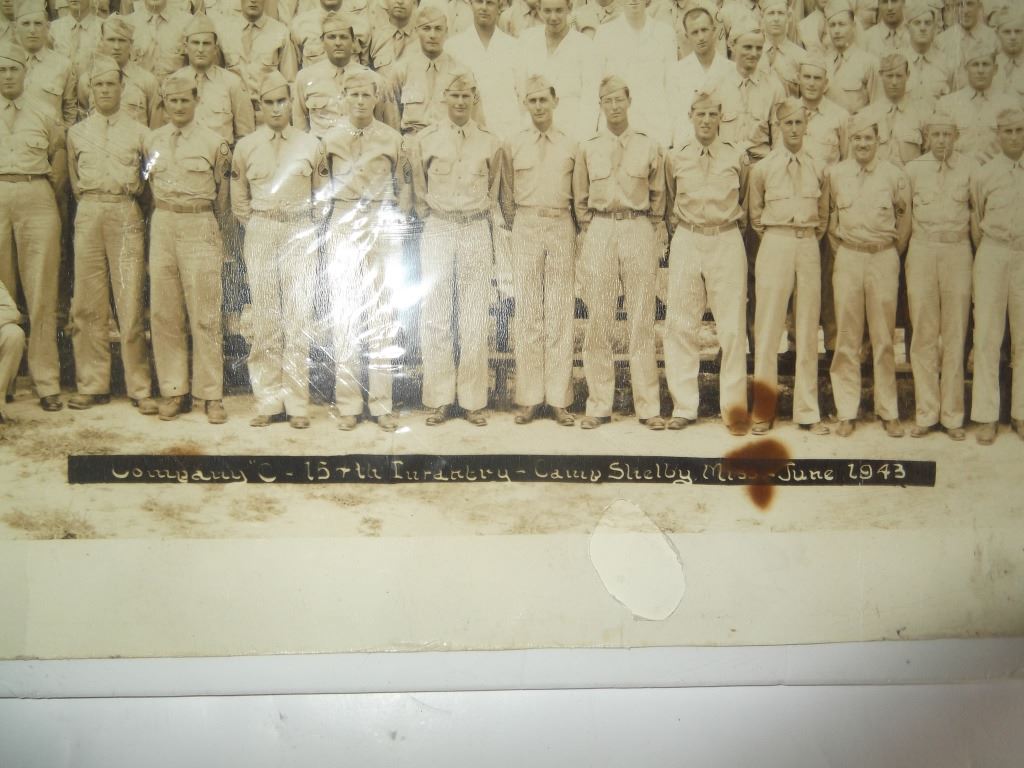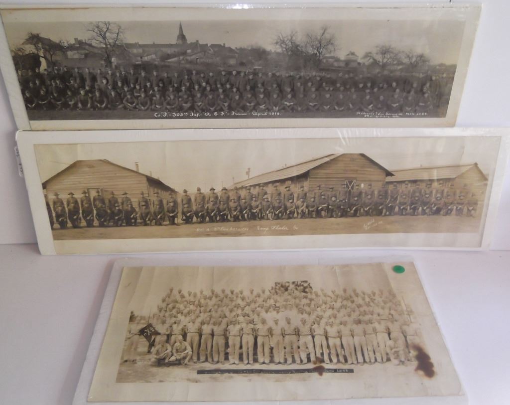 3 military panoramic photos including WWI Bat. A, 8th field Artillery camp Wheeler 1918, GA; Company F, 305th Infantry France 1919; & Company C, 15th infantry Camp Shelby, Miss 1943. Creases; stains; tears. Largest