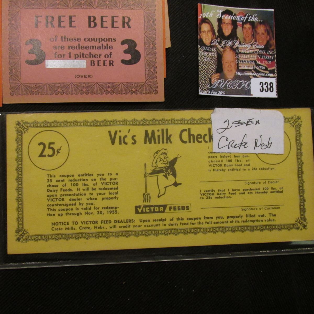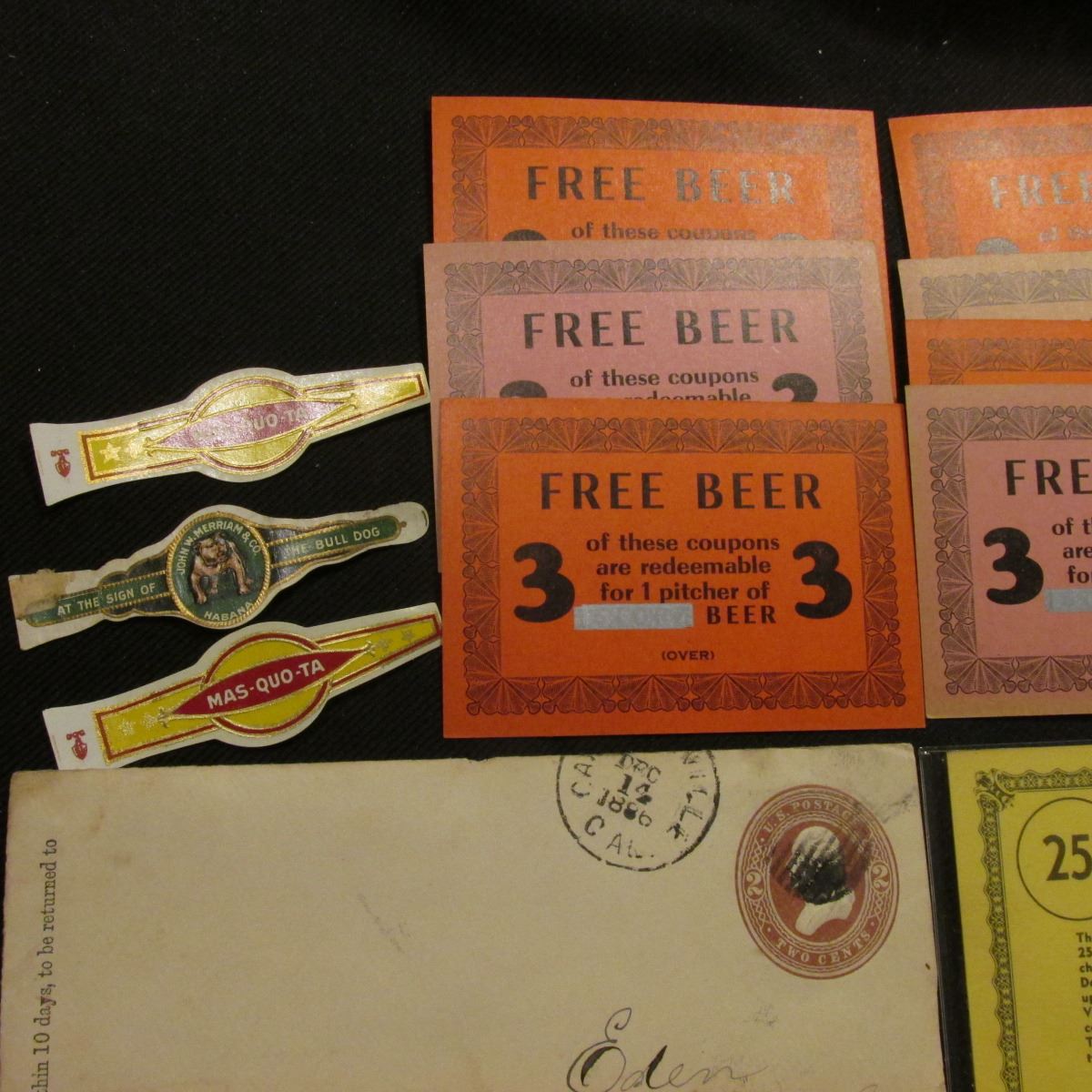(3) mint condition Cigar Bands; (6) two type "Free Beer" tickets from "H. Jacobsen 2401 Cuming"; "Dec. 14, 1886" stamped & Post marked cover with letter dates May 8th, 1886; & (6) "Vic's Milk Check…Victor Feeds" from Crete, Nebraska.