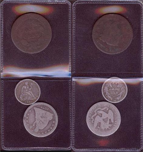 3 olde type coins; 1822 cent, 1877 quarter, 1890 dime, early type lot!