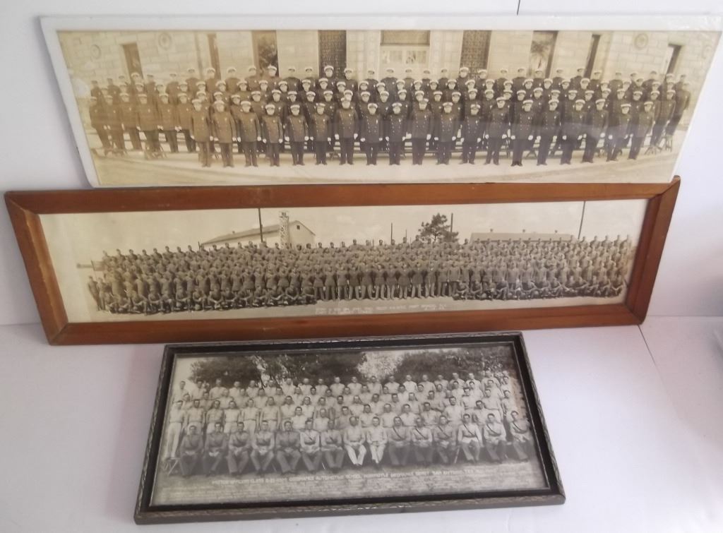 3 panoramic photos including Motor officers class 0-25-43m ordinance automotive school normoyle ordnance San Antonio, Tex 1945; WWII Btry A 5th BN. 2nd TNG. Regt. Fort Bragg 1945; & vintage police dept. group photo.
