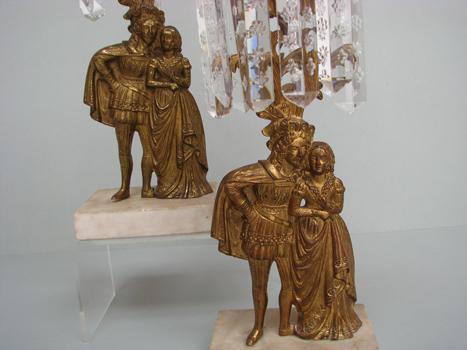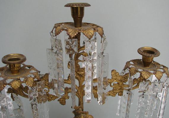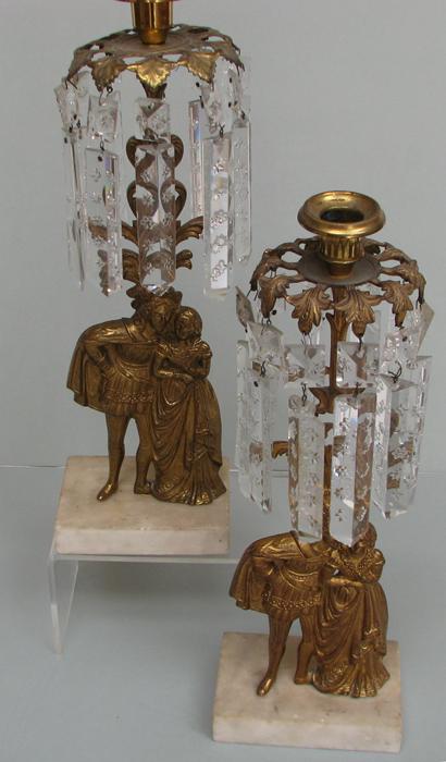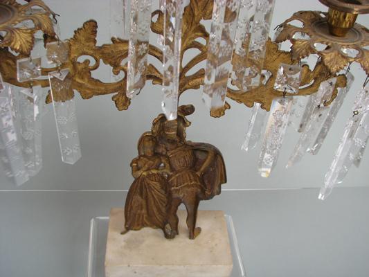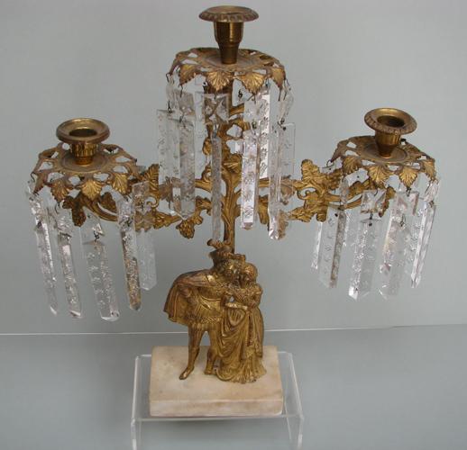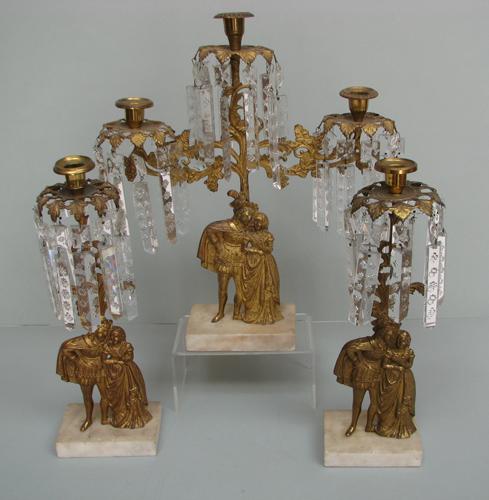 Title: 19th Century Gentleman and Lady American Girandoles with cut glass cystal prisms, Centerpiece has 3 lights and the side pieces have single candlesticks