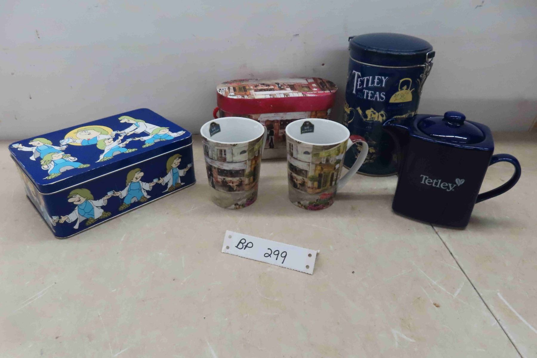 (3) pcs Tetly Tea - 1 Very Nice Teapot, 2 Cans, 2 Porcelin Mugs in a Box