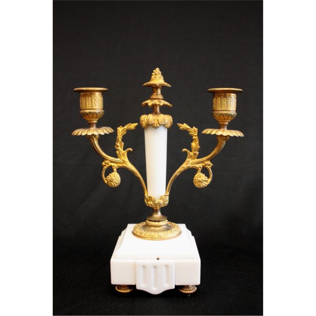 Enamel handpainted face, dore bronze, "Ram's Head & Leaf" design, French movement by Marti. Clock approx. 12" H, candelabrum 10" H, brass drapery missing. Please read our terms of sale.
