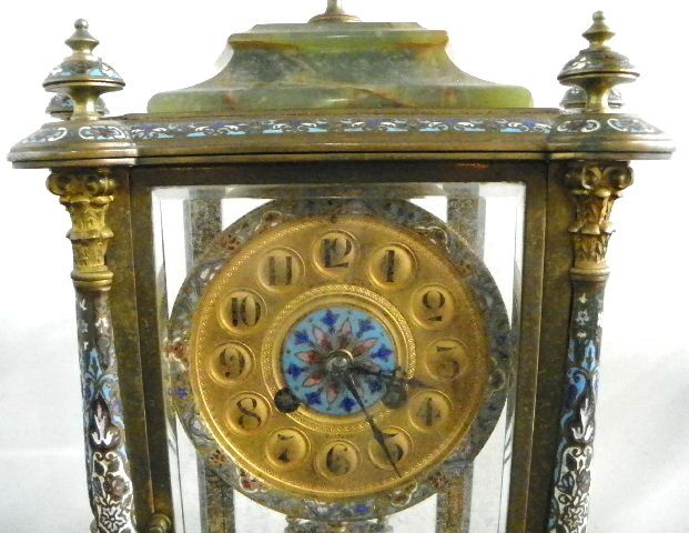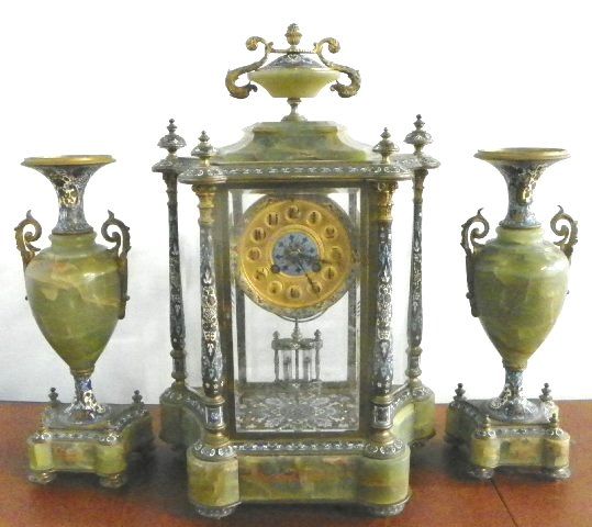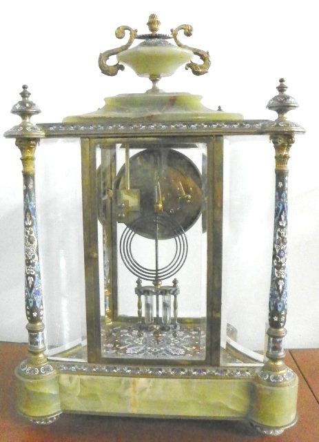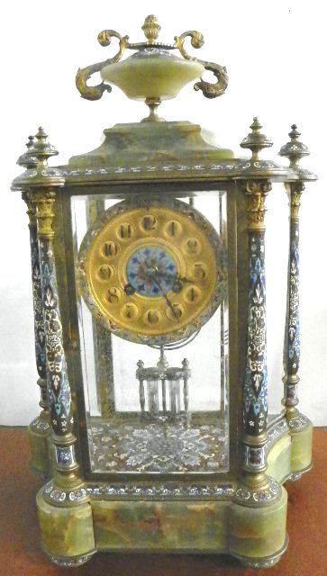 Pendulum is mercury & enamel, some enamel loss. Approx. 19.5" H x 12" W, coupes are 14" H. Please read our terms of sale.