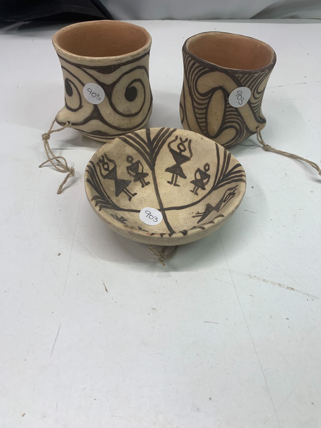 3 piece pottery set and 2 pottery eggs