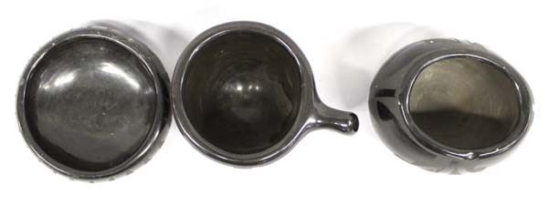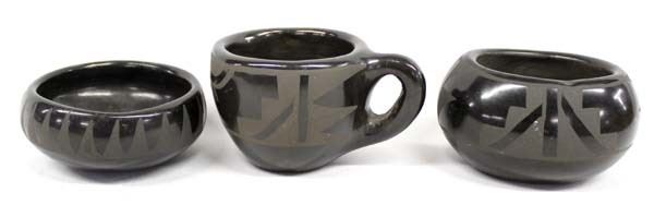 3 Pieces of Native America Santa Clara Pottery, includes 1. Cup, unsigned, measures 2.25'' x 4'' x 3'' 2. Oval Bowl dated 1969 by Cresencia Tafoya (1918-1999), measures 4'' x 2.25'' x 3.25'' and is signed, FYI: ''Cresencia Tafoya, Santa Clara Pueblo, potted during a time when pueblo pottery was in its heyday, which is from World War II to the end of the 1900s. She was known for her black-on-black jars, wedding vases, carved blackware seed jars, and polychrome redware oval bowls.'' 3. Bowl by Cresencia Tafoya, measures 4'' x 1.5''H, FYI: ''Cresencia Tafoya, Santa Clara Pueblo, potted during a time when pueblo pottery was in its heyday, which is from World War II to the end of the 1900s. She was known for her black-on-black jars, wedding vases, carved blackware seed jars, and polychrome redware oval bowls.''