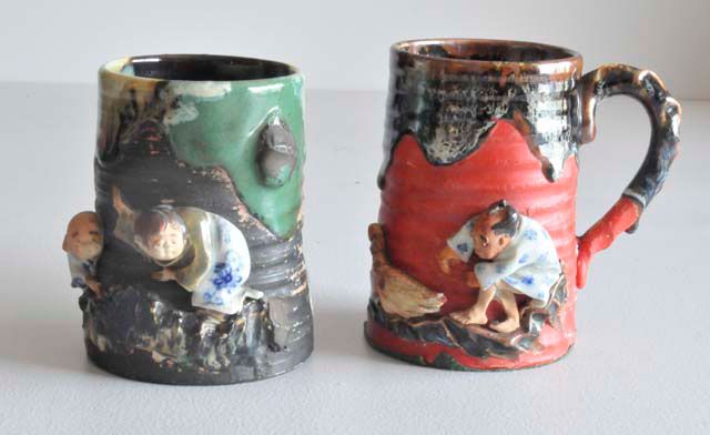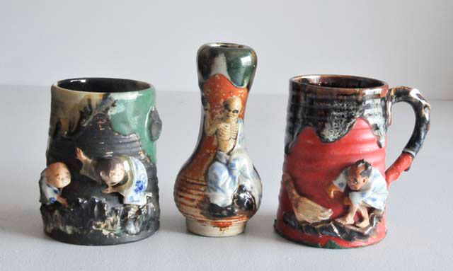 Including: 1- Mug with "2 Children", with Ban-ni mark, approx. 4.75" H. 1- Vase with relief of "Skeletal Half Dressed Man", approx. 6" H. 1- Mug with handle with relief of "Child Trying to Catch a Bird", small chip, approx. 5" H.