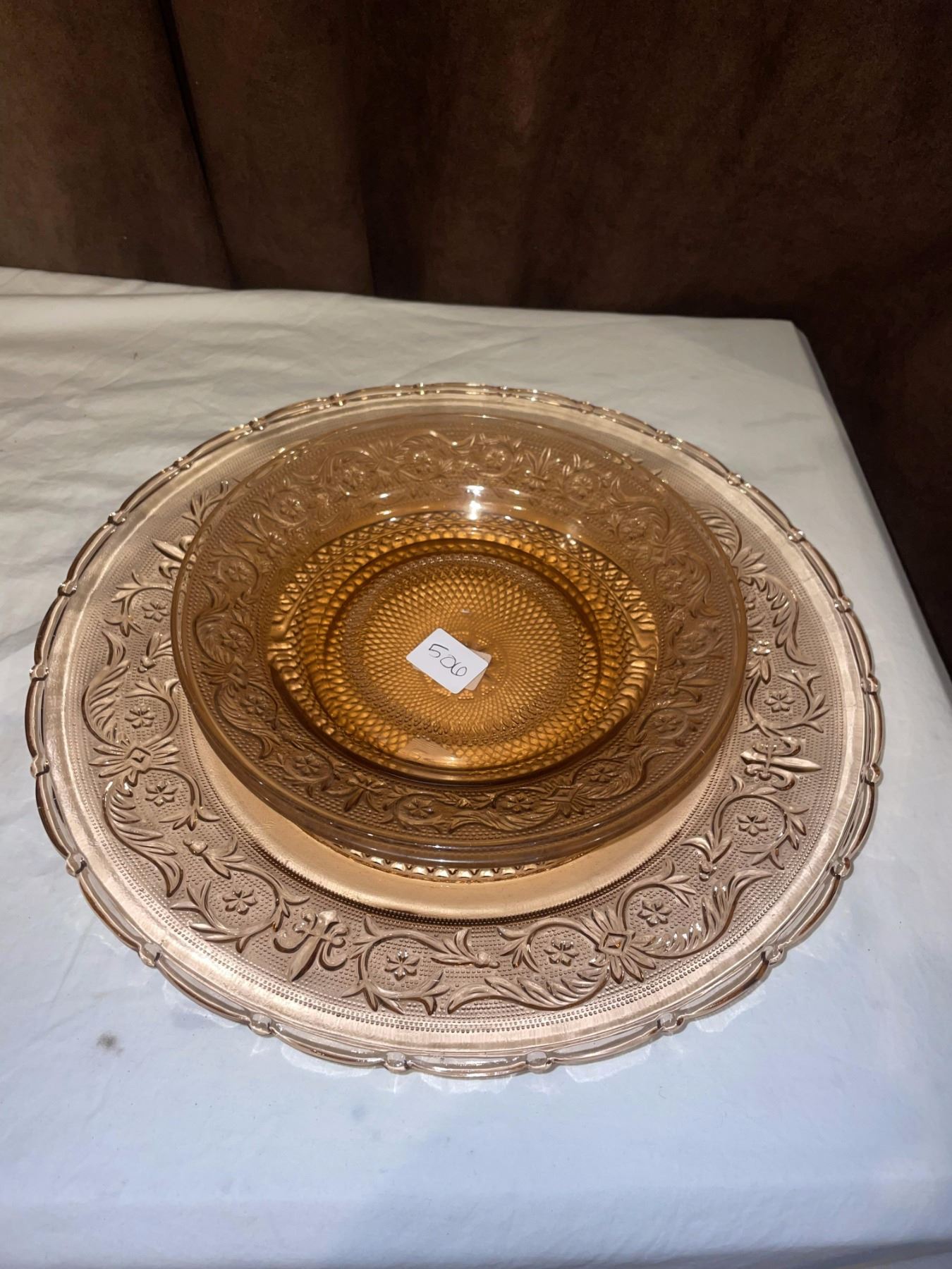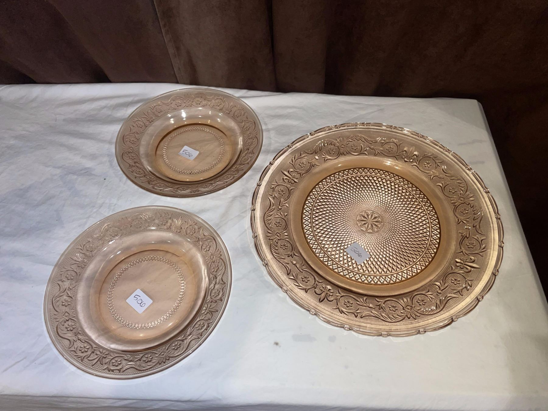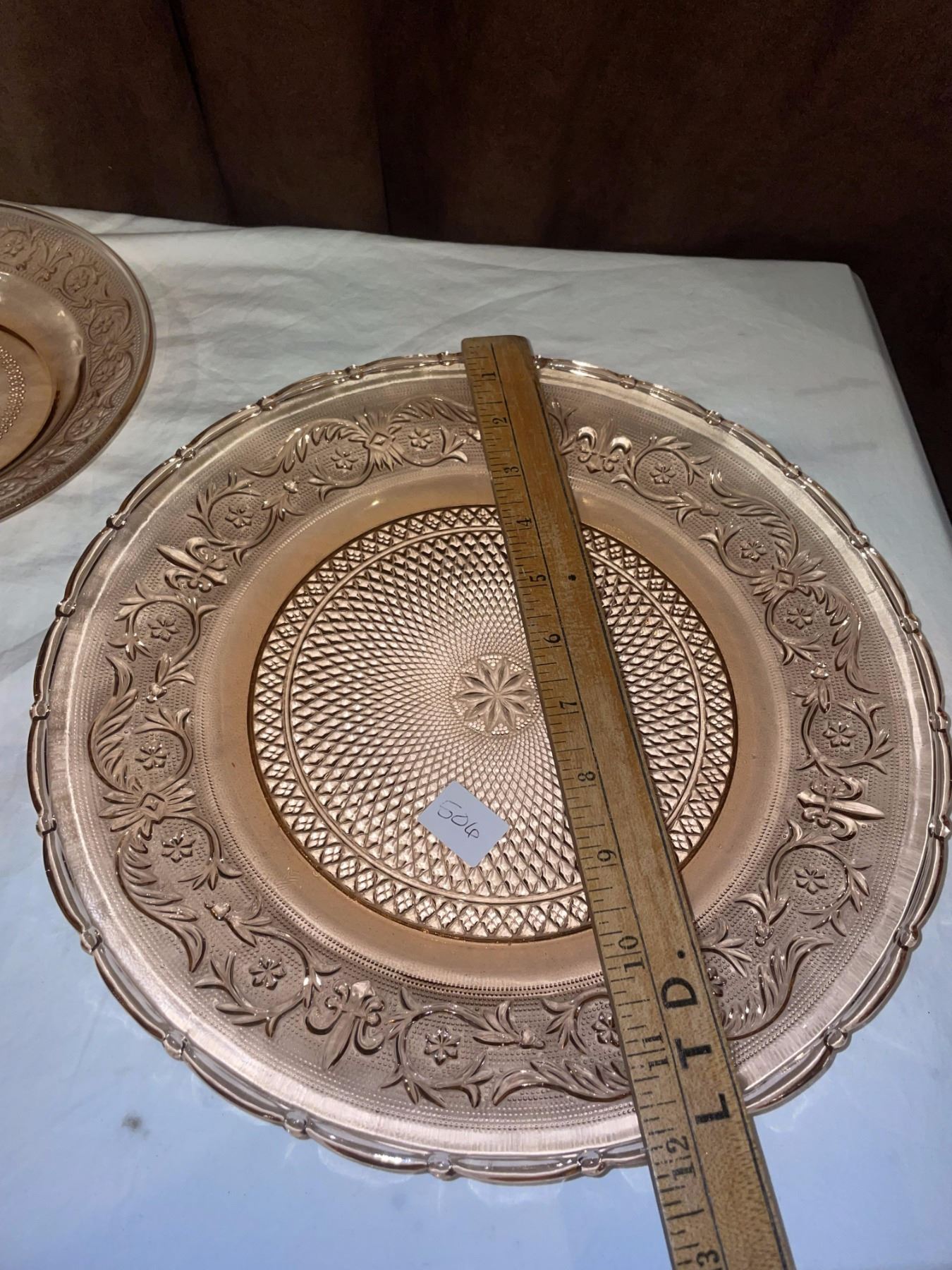 3 pieces of Pink Depression Glass Large plate is Trellis Fleur De Lis Pattern, and smaller sandwich plates are Fleur De Lis Pattern. No chips or cracks.