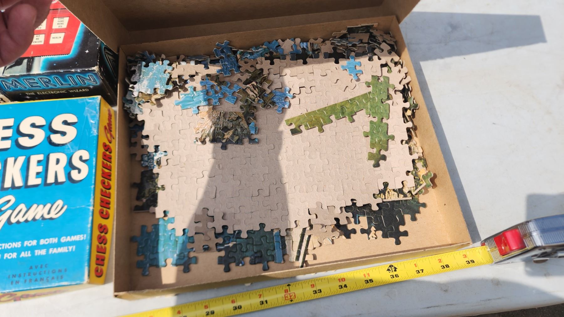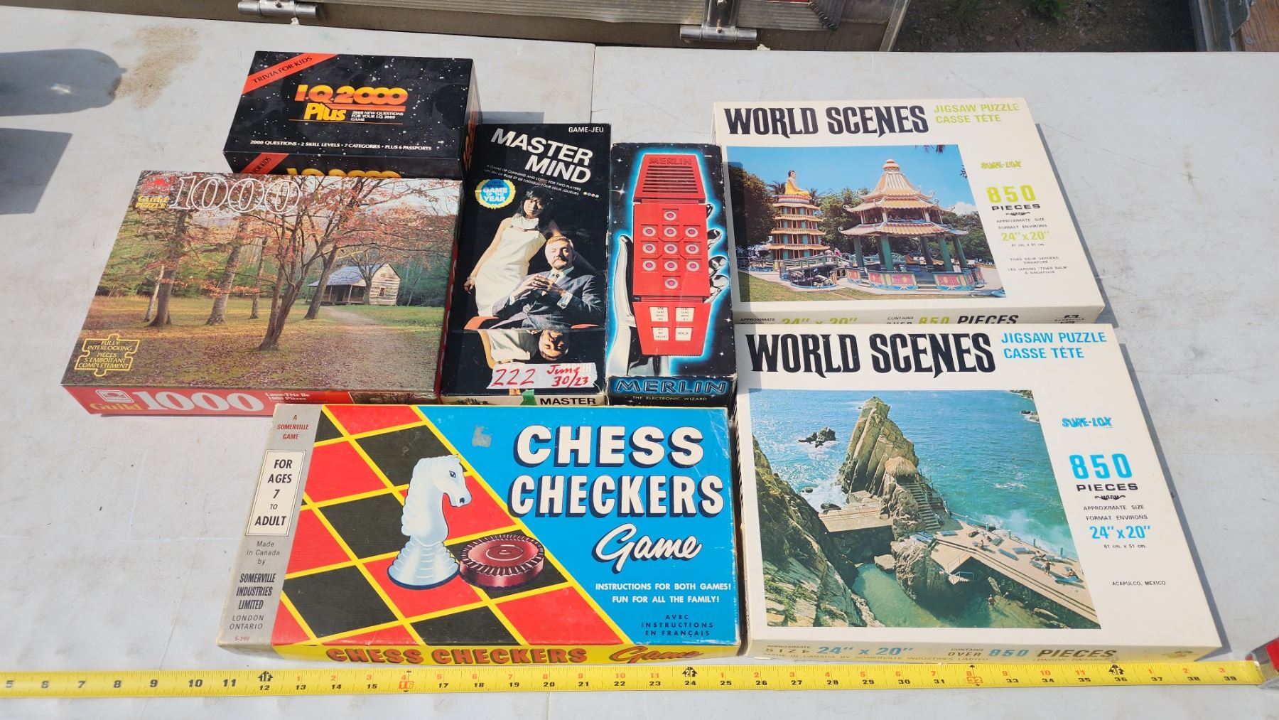 3 puzzles & 4 Vintage edition boardgames: Master Mind, Chess/checkers, Trivia for Kids