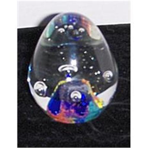Just under 1# this is a pear shaped paperweight. The cobalt block on the bottom has a canted side and is dusted with green, yellow & coral. Each side has a slight depression. The center is surrounded with 4 satellites {bubbles} lending to the out of world feel. Certainly a conversation piece. Unique!