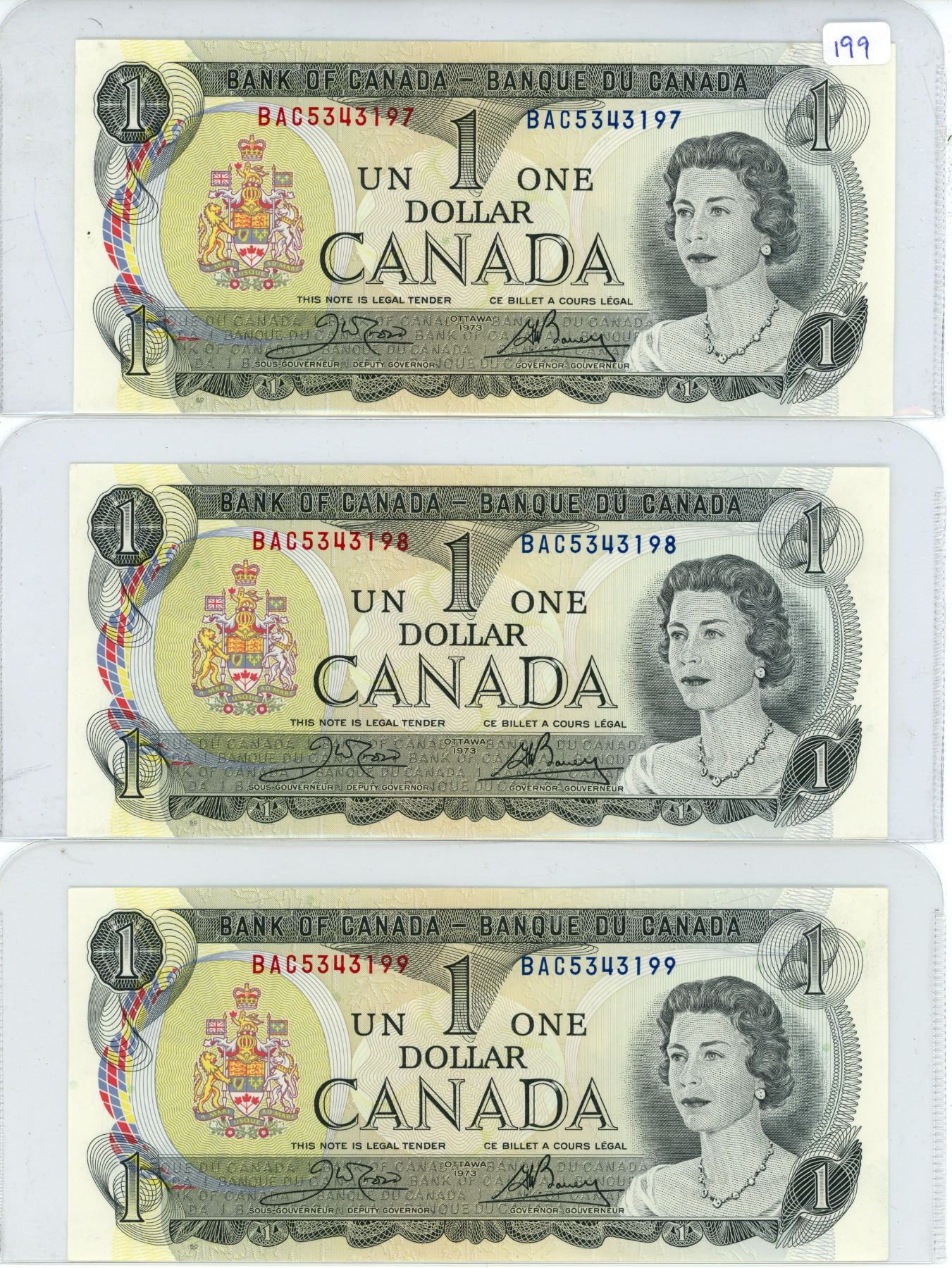 3 sequential 1973 Bank of Canada One Dollar Notes BAC5343197-BAC5343199