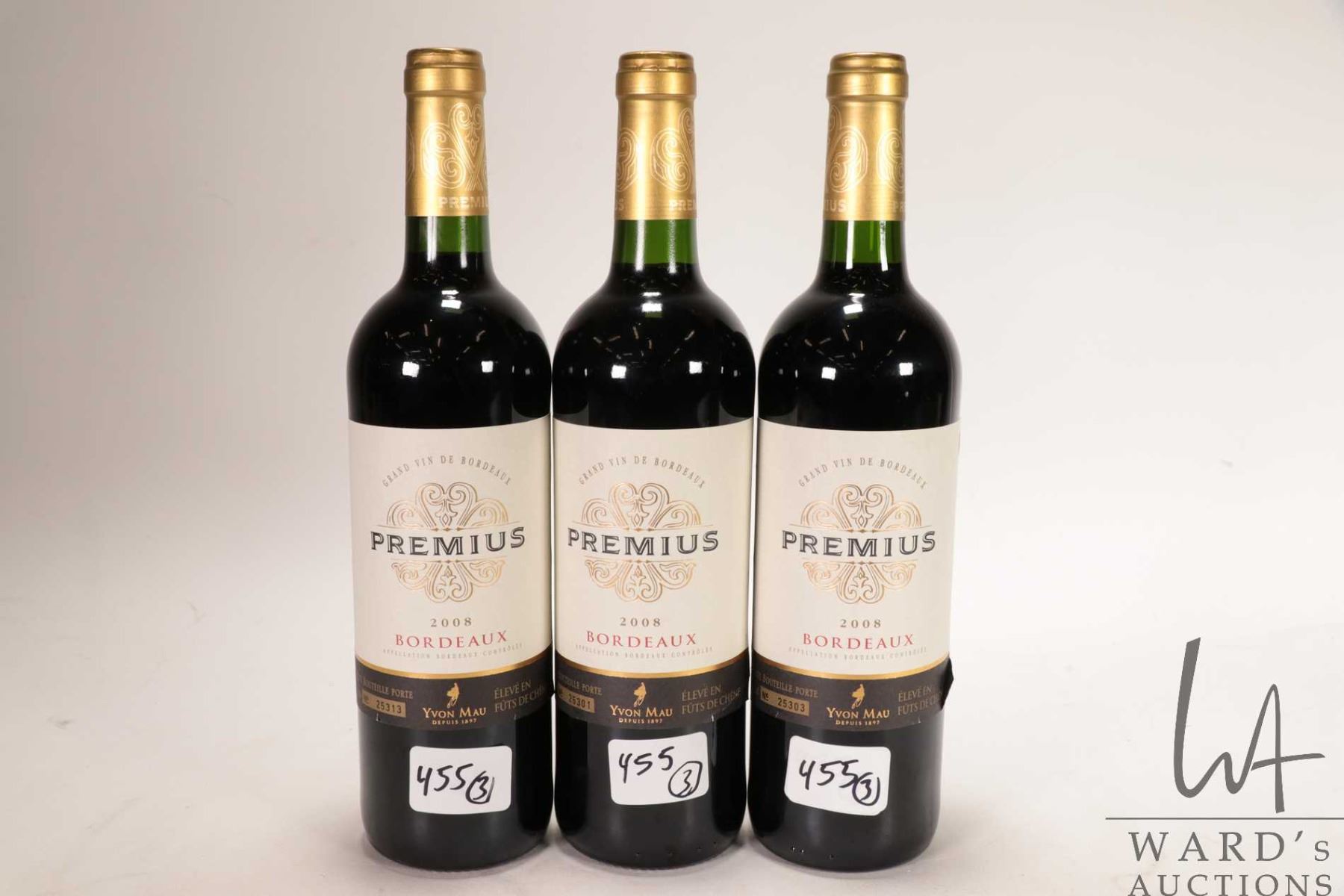 3 serialized bottles of Premius / 2008 Bordeaux / 750ml / 12.5% ABV Note: Alcohol cannot be insured