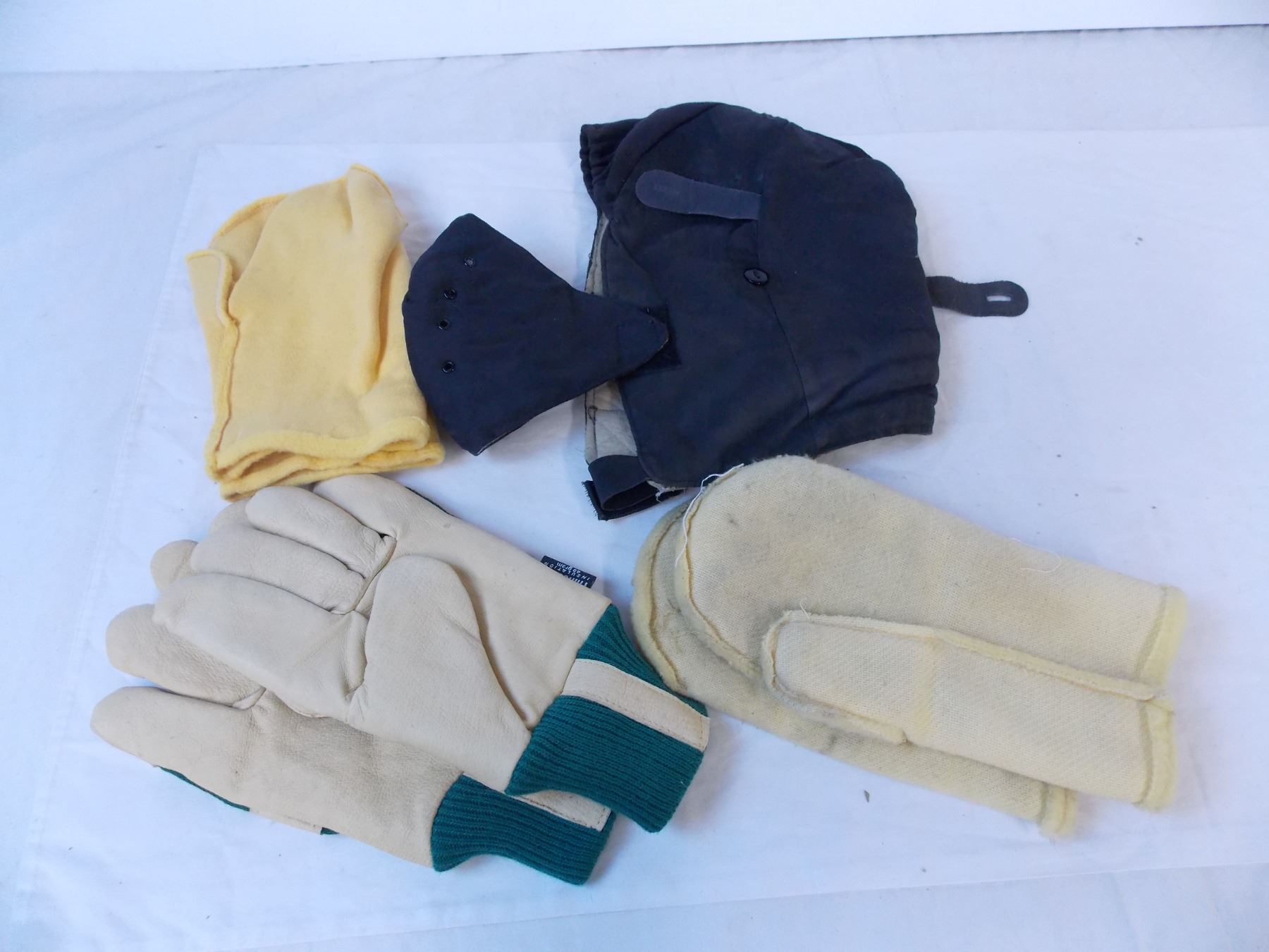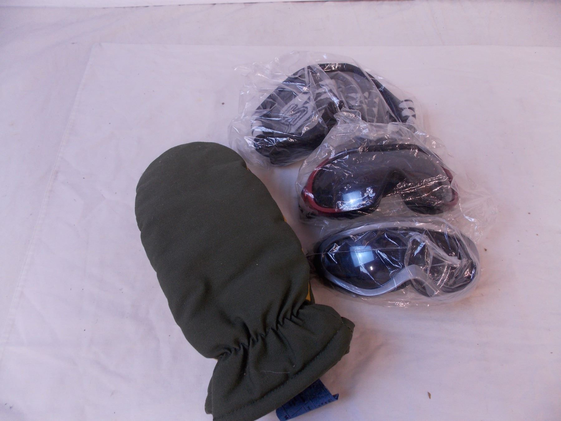 (3) ski goggles, (4) pairs gloves and head covering