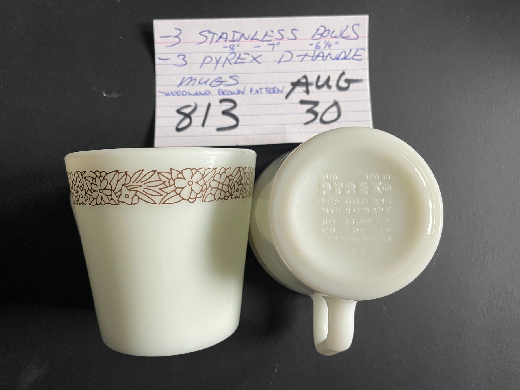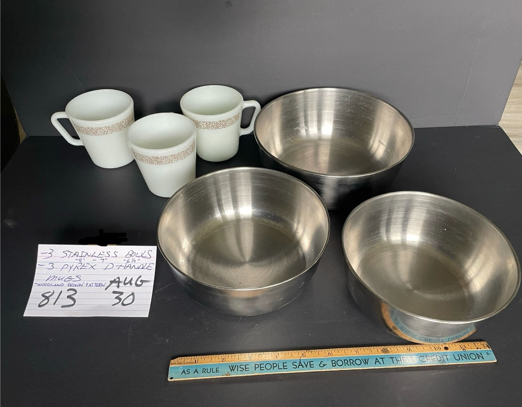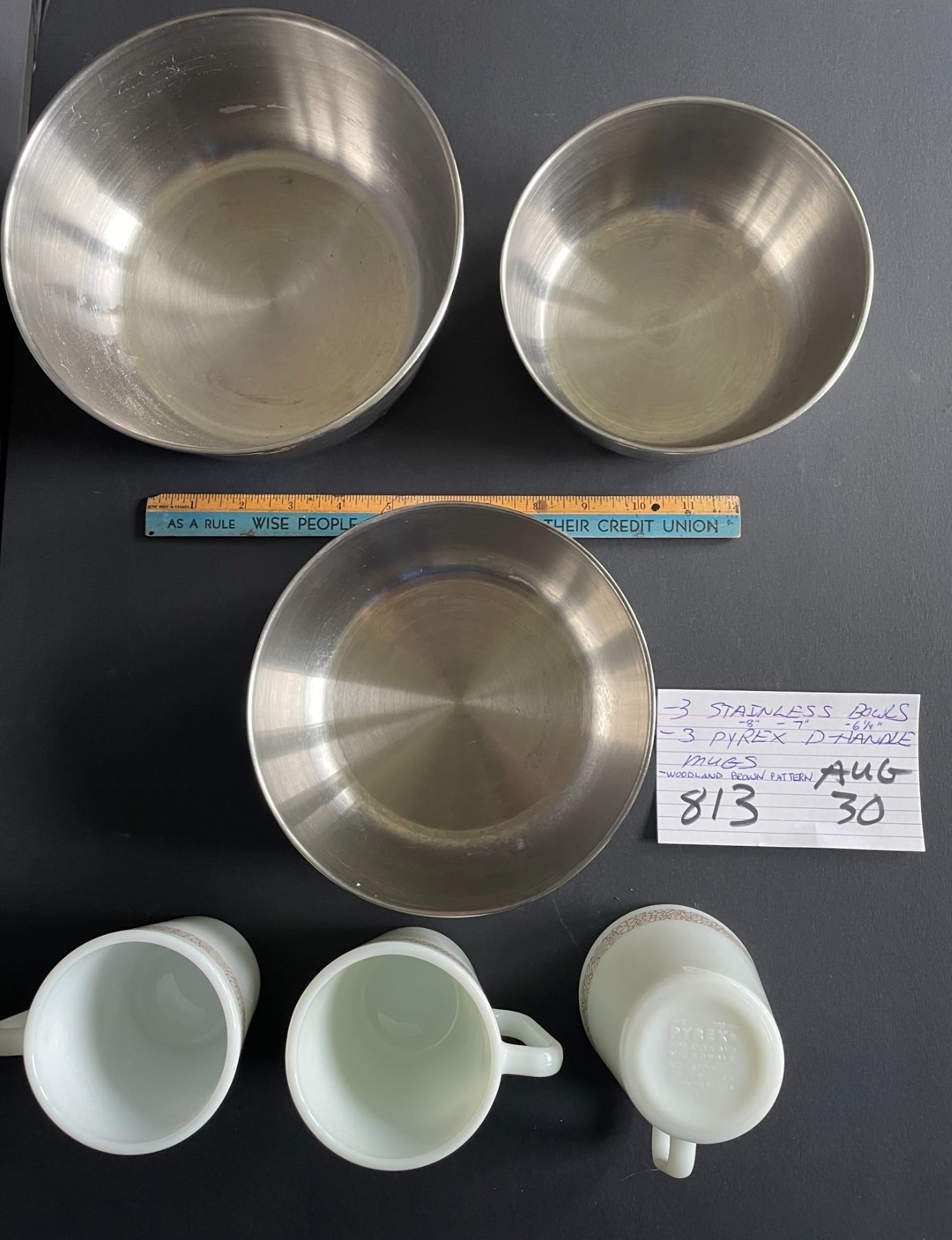 3 stainless bowls - 3 Pyrex D-handle mugs