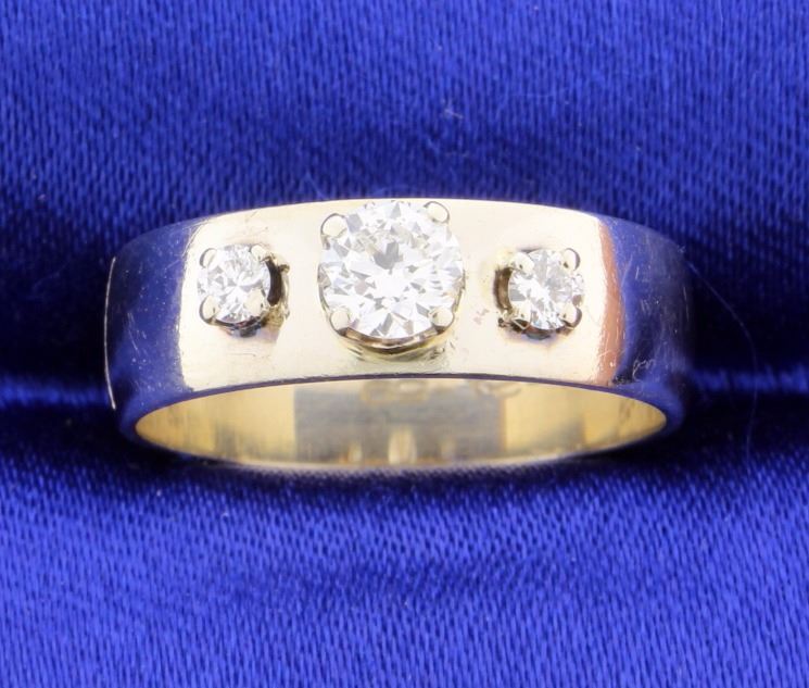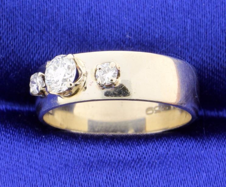 Beautiful 3 stone diamond ring set in a gorgeous 14k yellow gold band. The center diamond is approximately 0.40 carats and the two side diamonds weight 0.08 carats each for a total diamond weight of 0.56 carats. The diamonds are SI1 clarity and G-H color. The gold band is 6mm wide and a size 8. 4.7g