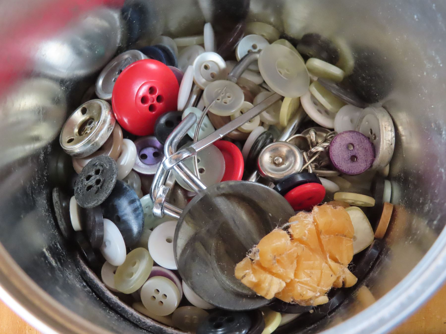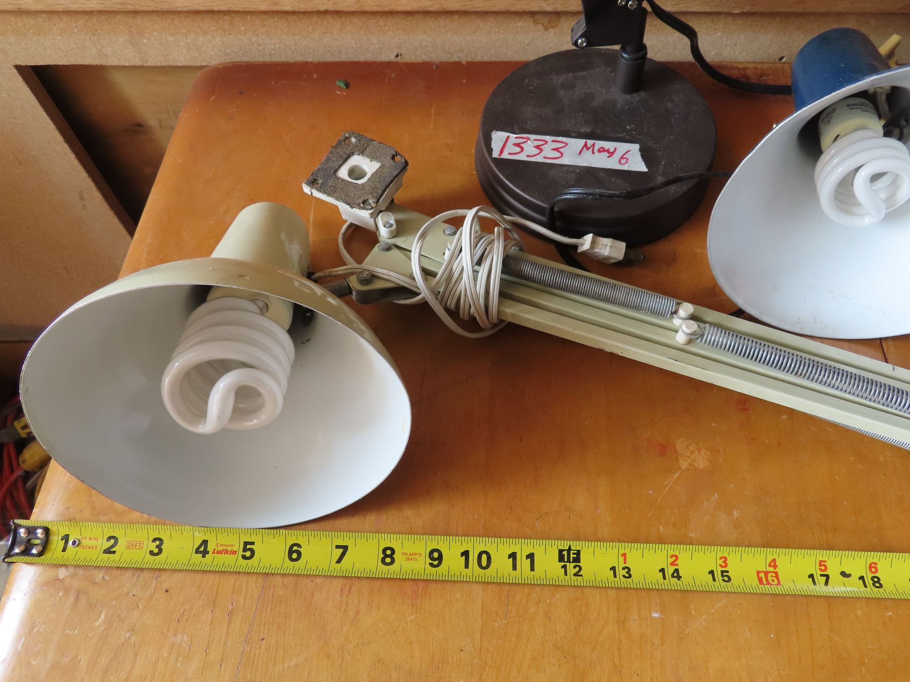3 table top lamp stands- adjustable - & a container of threads & buttons