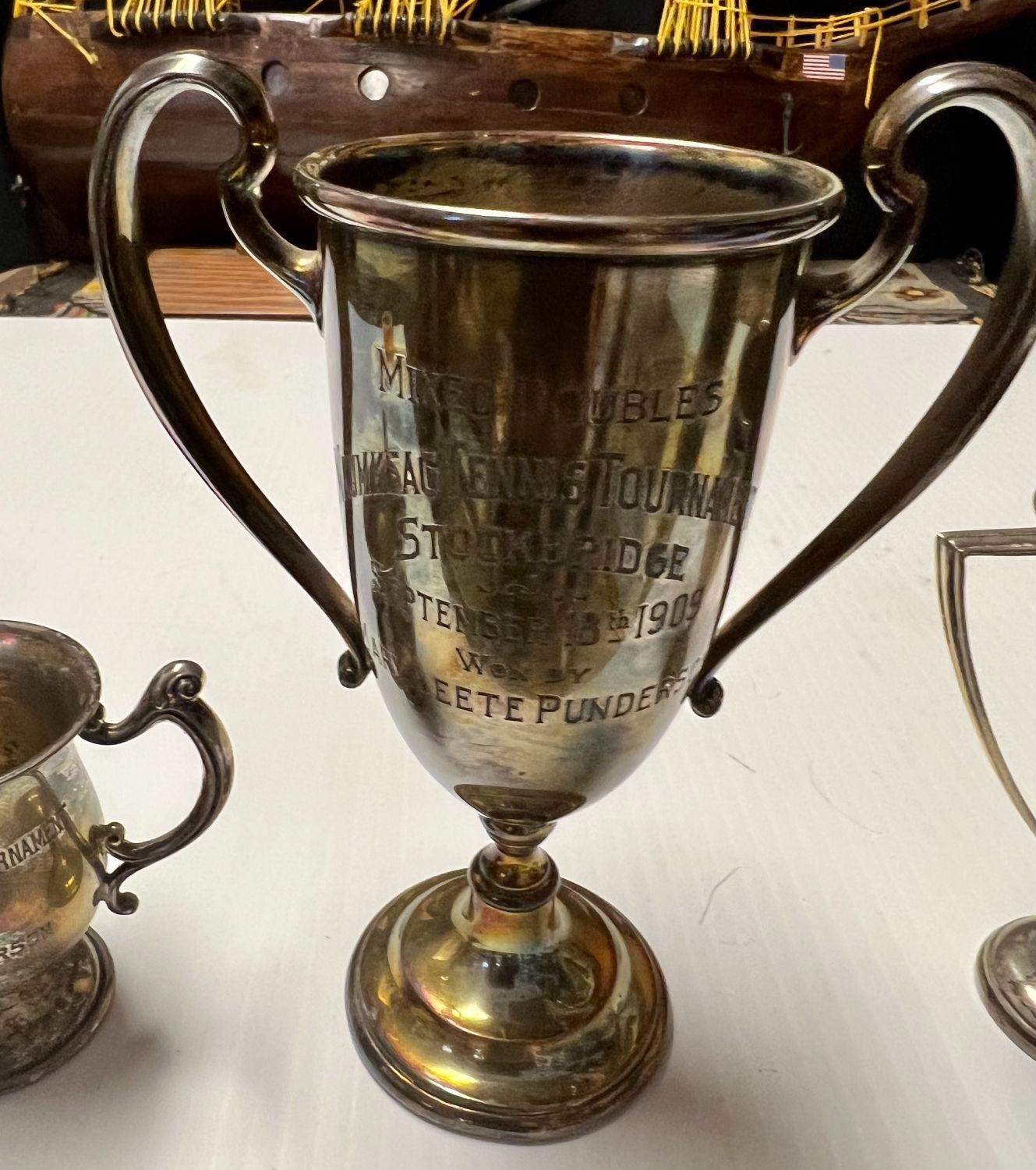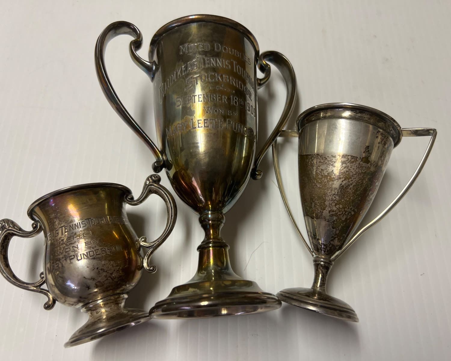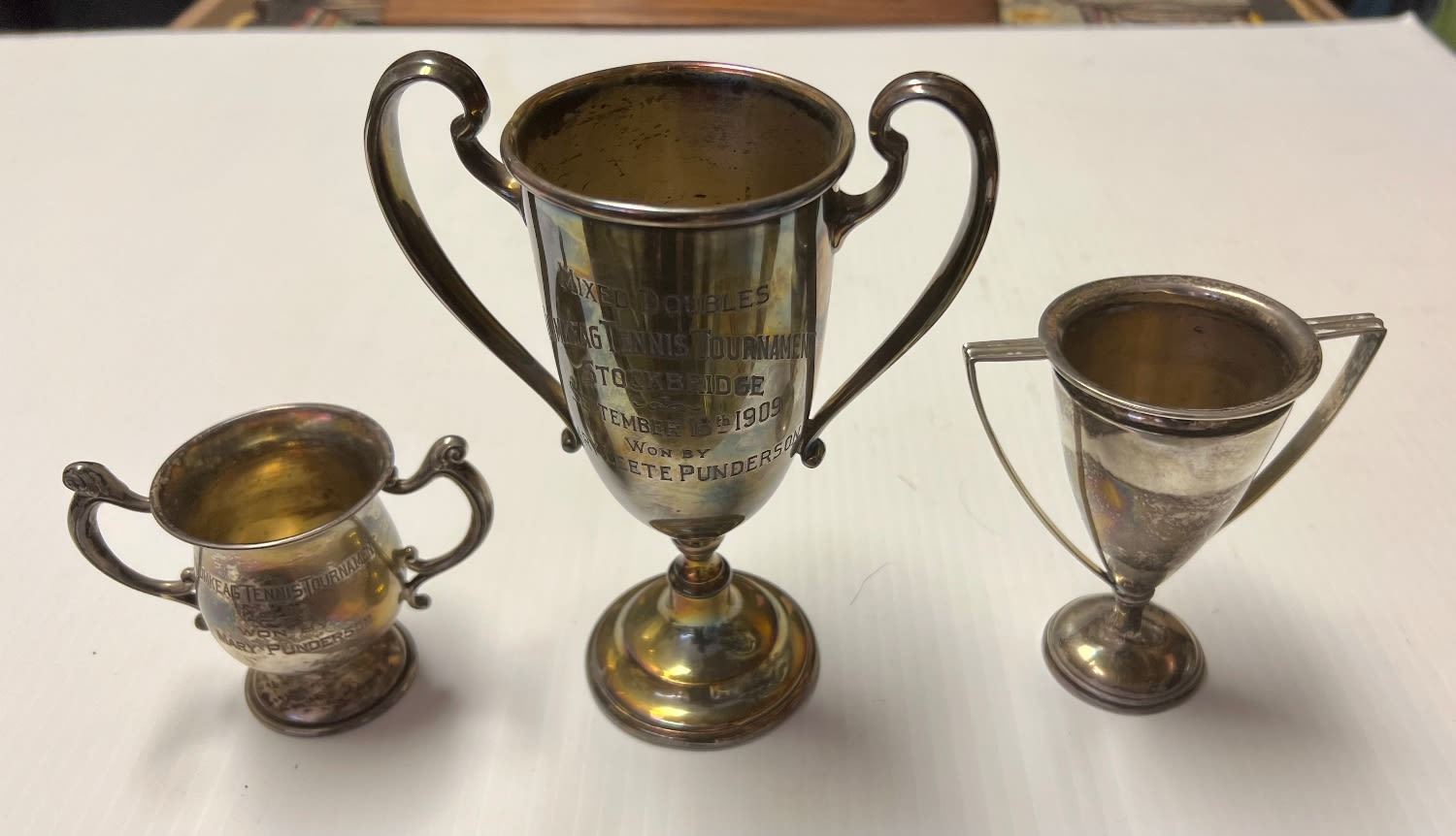 Heights range from 2.5 to 4H to 6H all handled Inscribed NAUMKEAG TENNIS TOURNAMENT Stockbridge 9/18/1909 other dates of 1910 & 1911 Charming set Silver makers REED & BARTON and BLACK STAR & FROST