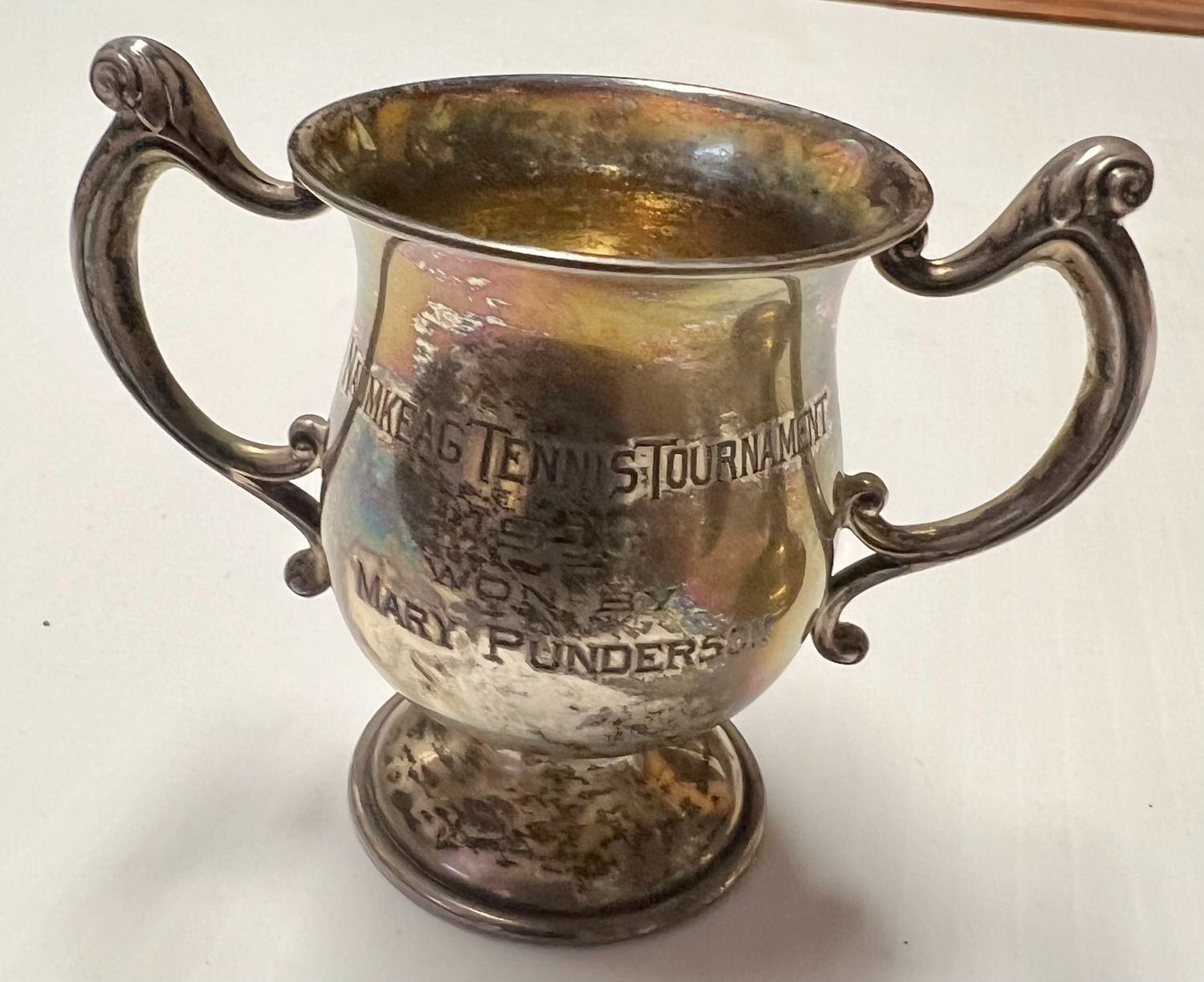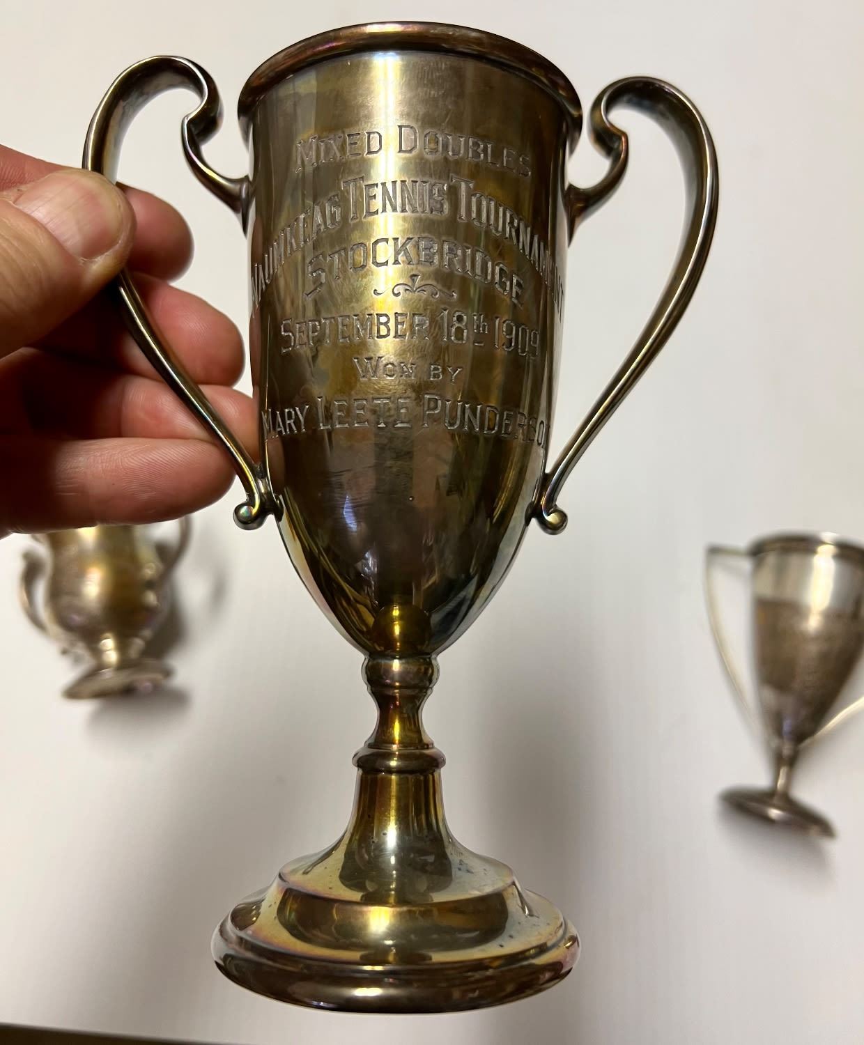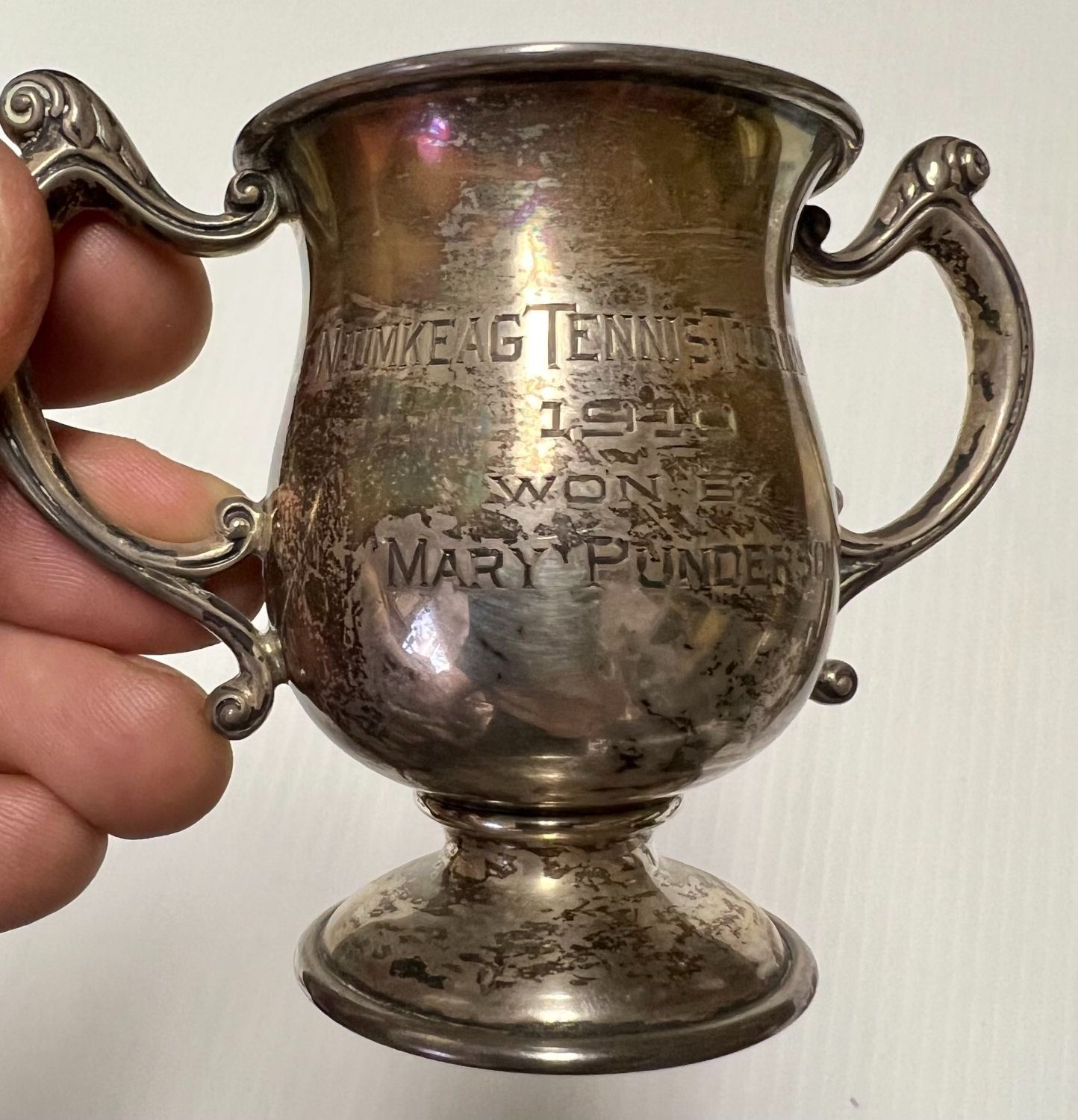 Heights range from 2.5 to 4H to 6H all handled Inscribed NAUMKEAG TENNIS TOURNAMENT Stockbridge 9/18/1909 other dates of 1910 & 1911 Charming set Silver makers REED & BARTON and BLACK STAR & FROST