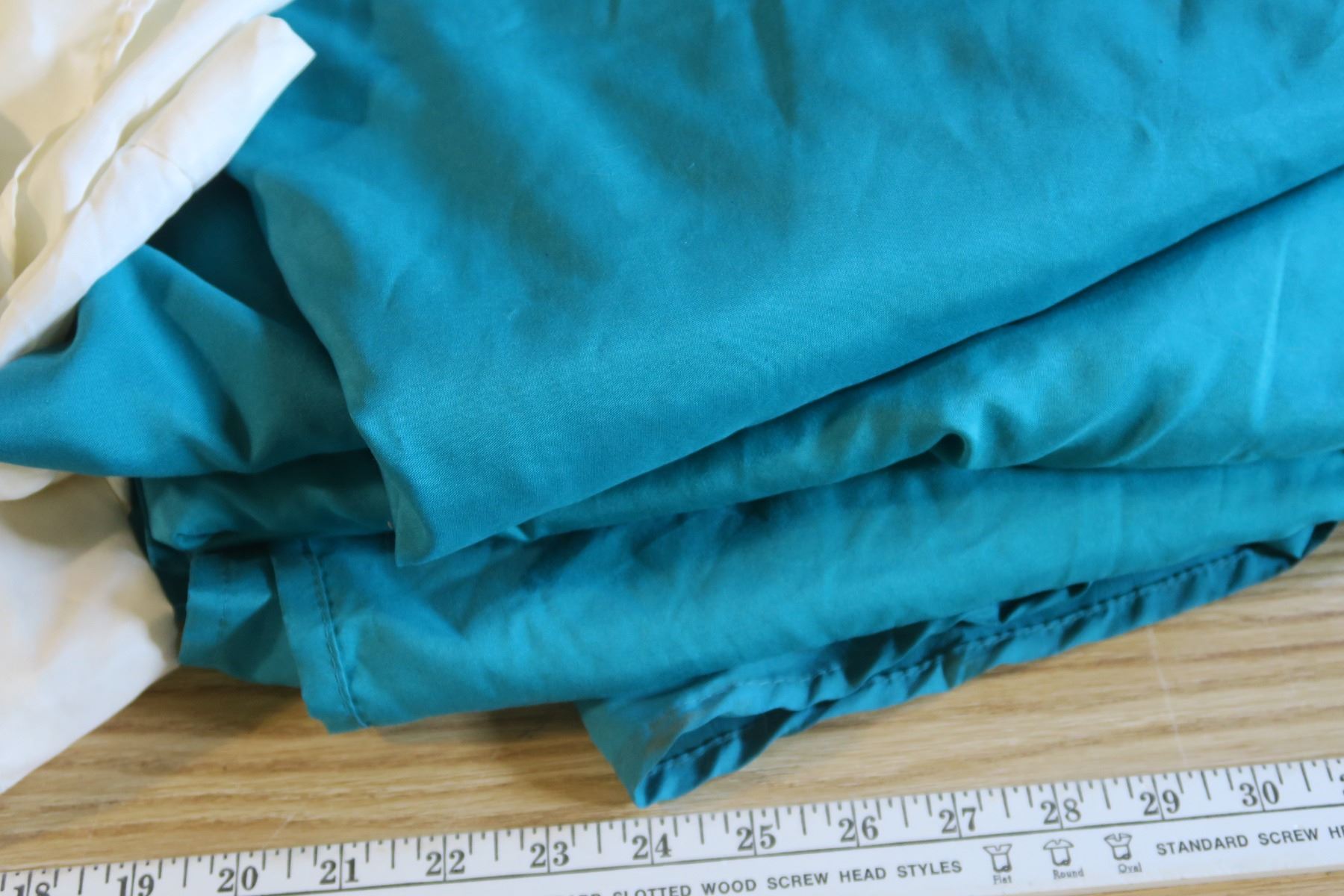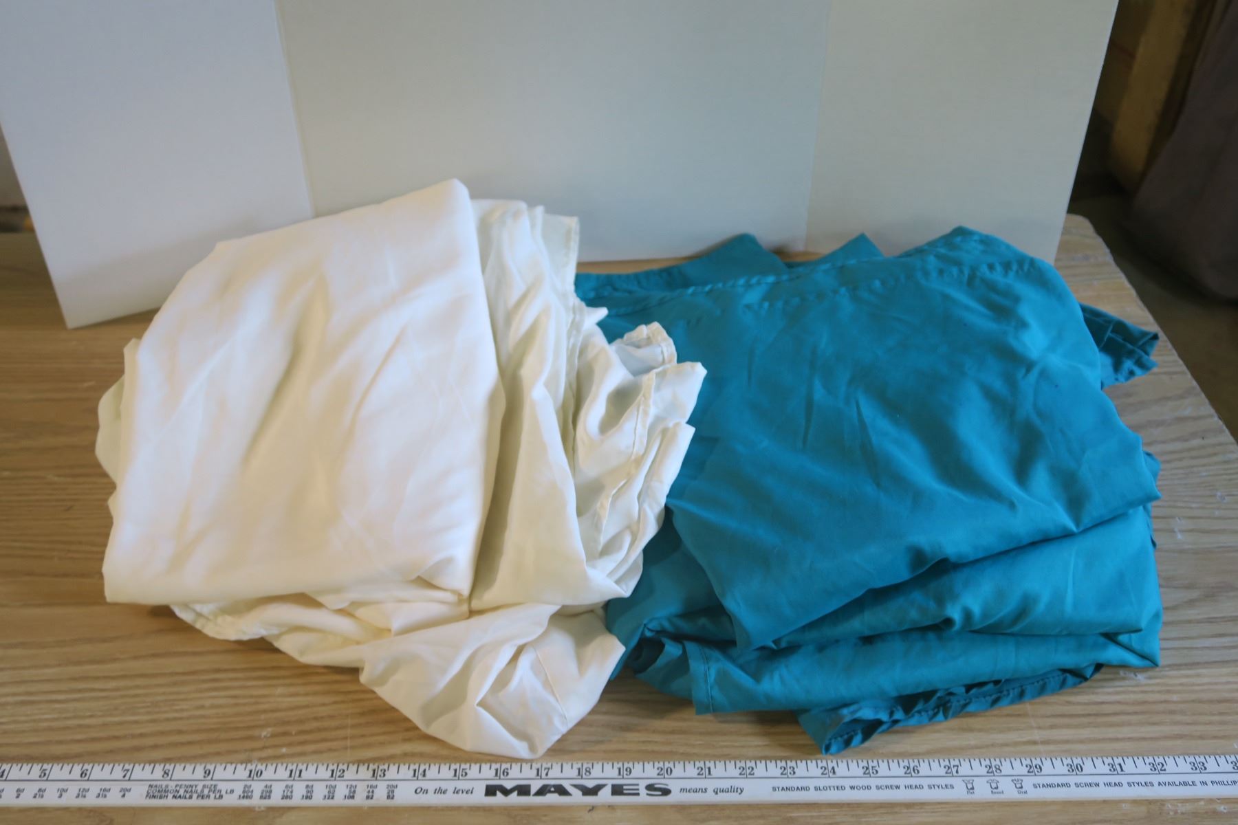 3 turquoise, 3 cream king size flat sheets used for trade show tables