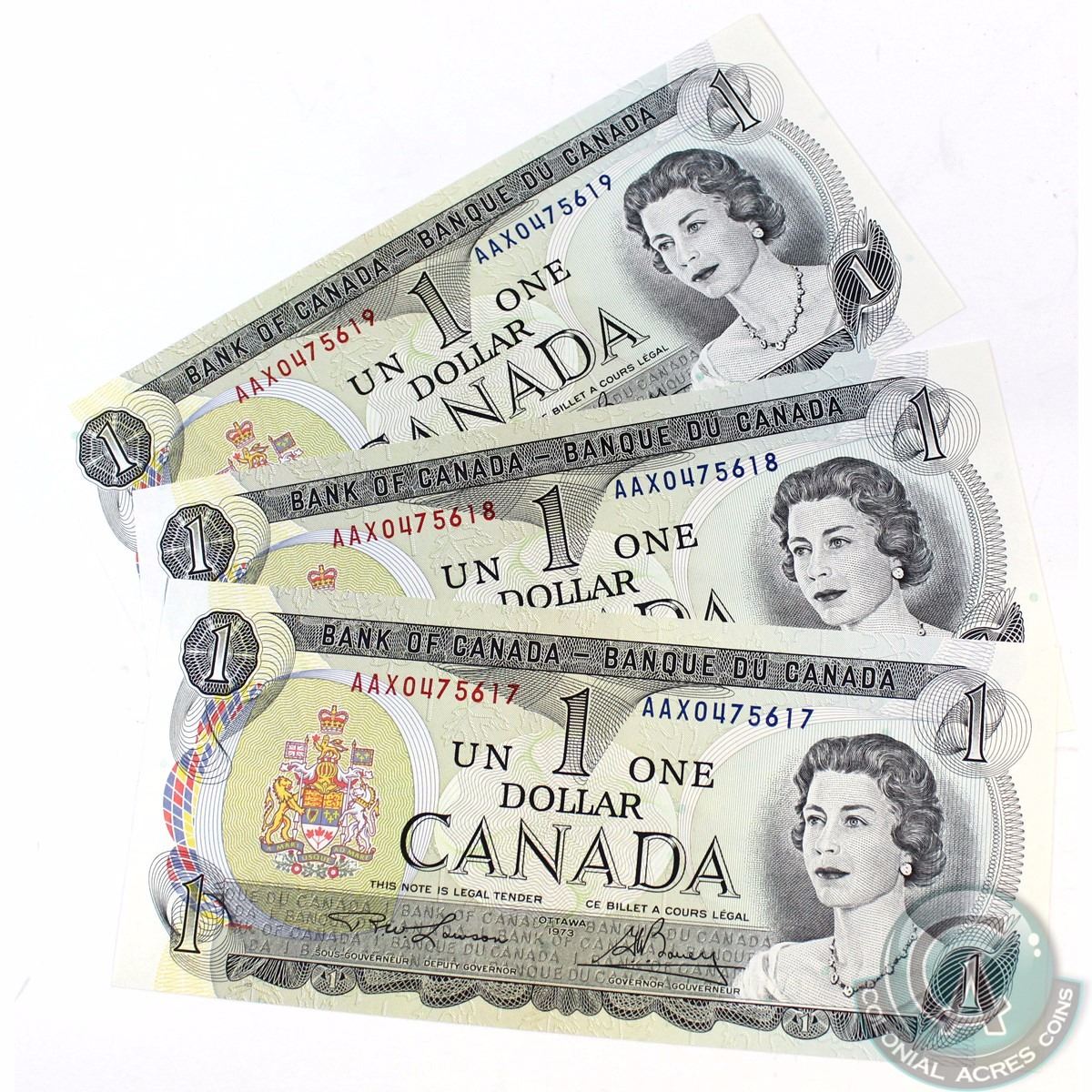 3 x 1973 Replacement $1 Notes with Lawson-Bouey Signatures, AAX Prefix and Consecutive Serial Numbers. 3pcs