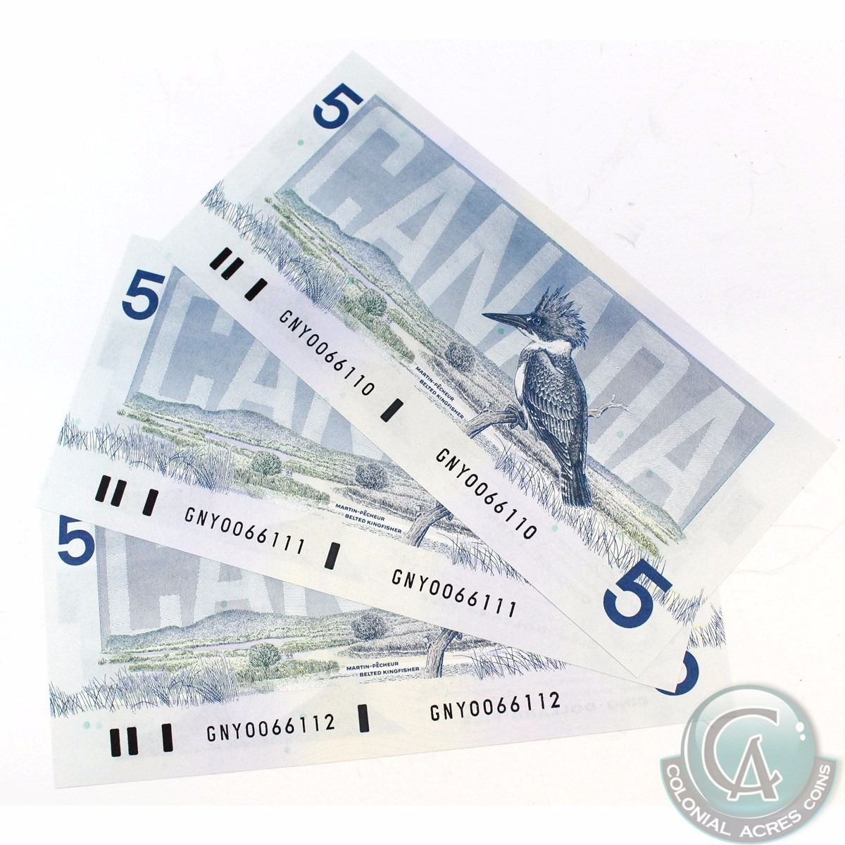 3 x 1986 $5 Notes with Thiessen-Crow Signatures, Changeover Prefix GNY and Consecutive Serial Numbers. 3pcs