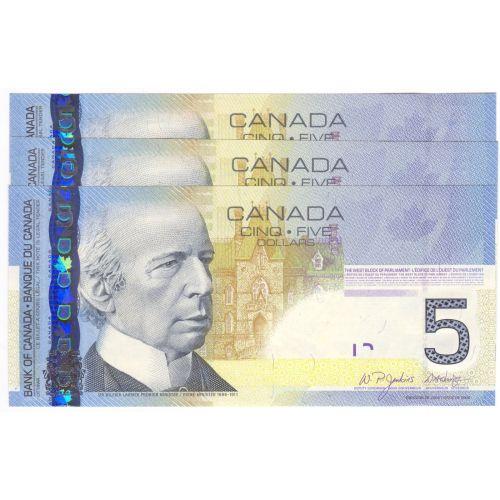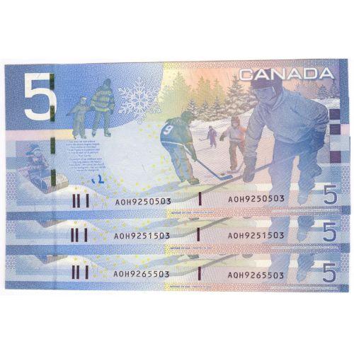 Bank of Canada, 3 x $5.00 Insert notes 2006, grade AU-UNC wavy as found in brick, Charlton # BC-67aA, signature Jenkins Dodge, serial AOH9250503-1503-5503, insert range 9.240M - 9.280M. # notes from same sheet.