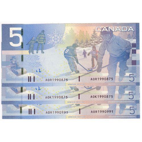 Bank of Canada, 3 x $5.00 Insert notes 2006, grade AU-UNC wavy as found in brick, Charlton # BC-67aA, signature Jenkins Dodge, serial AOK1990875, insert range 1.960M - 2.160M, AOR1990875 (same number as the AOK insert) & AOR1990911 Radar. All 3 notes were found in the same brick, The auctioneer has never of matched noted in the same brick before.