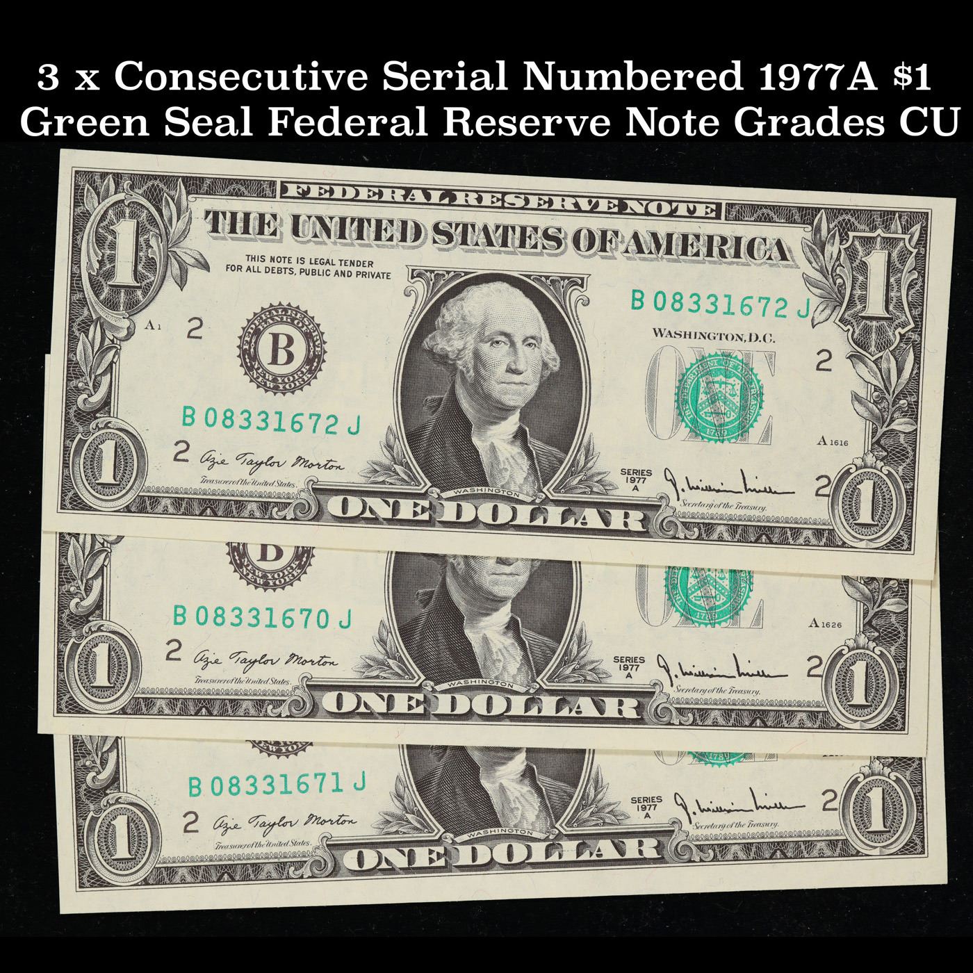 3 x Consecutive Serial Numbered 1977A $1 Green Seal Federal Reserve Note Grades CU.
