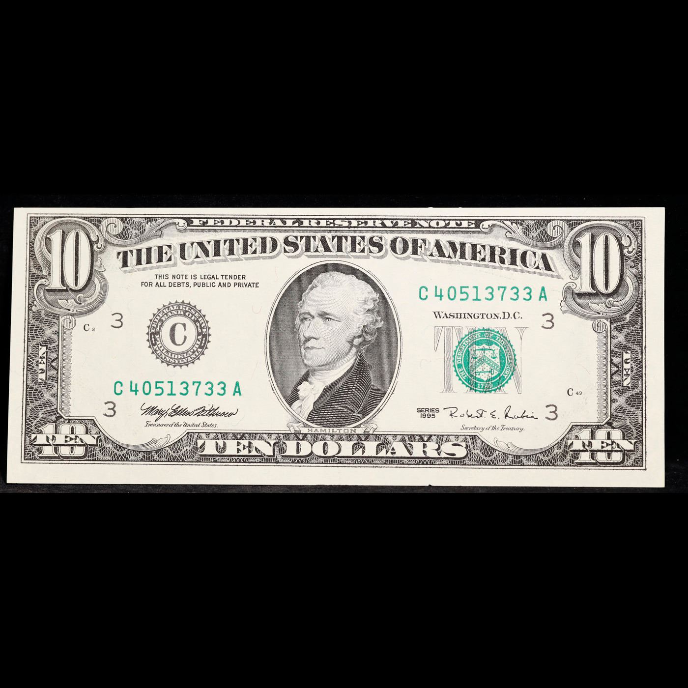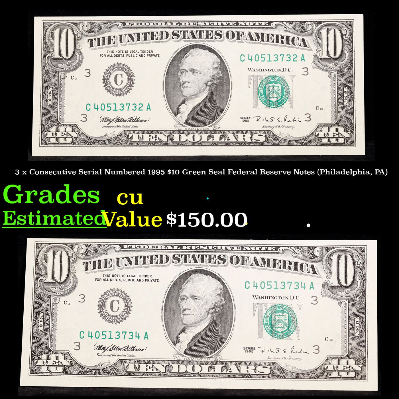 3 x Consecutive Serial Numbered 1995 $10 Green Seal Federal Reserve Notes (Philadelphia, PA) Grades CU.