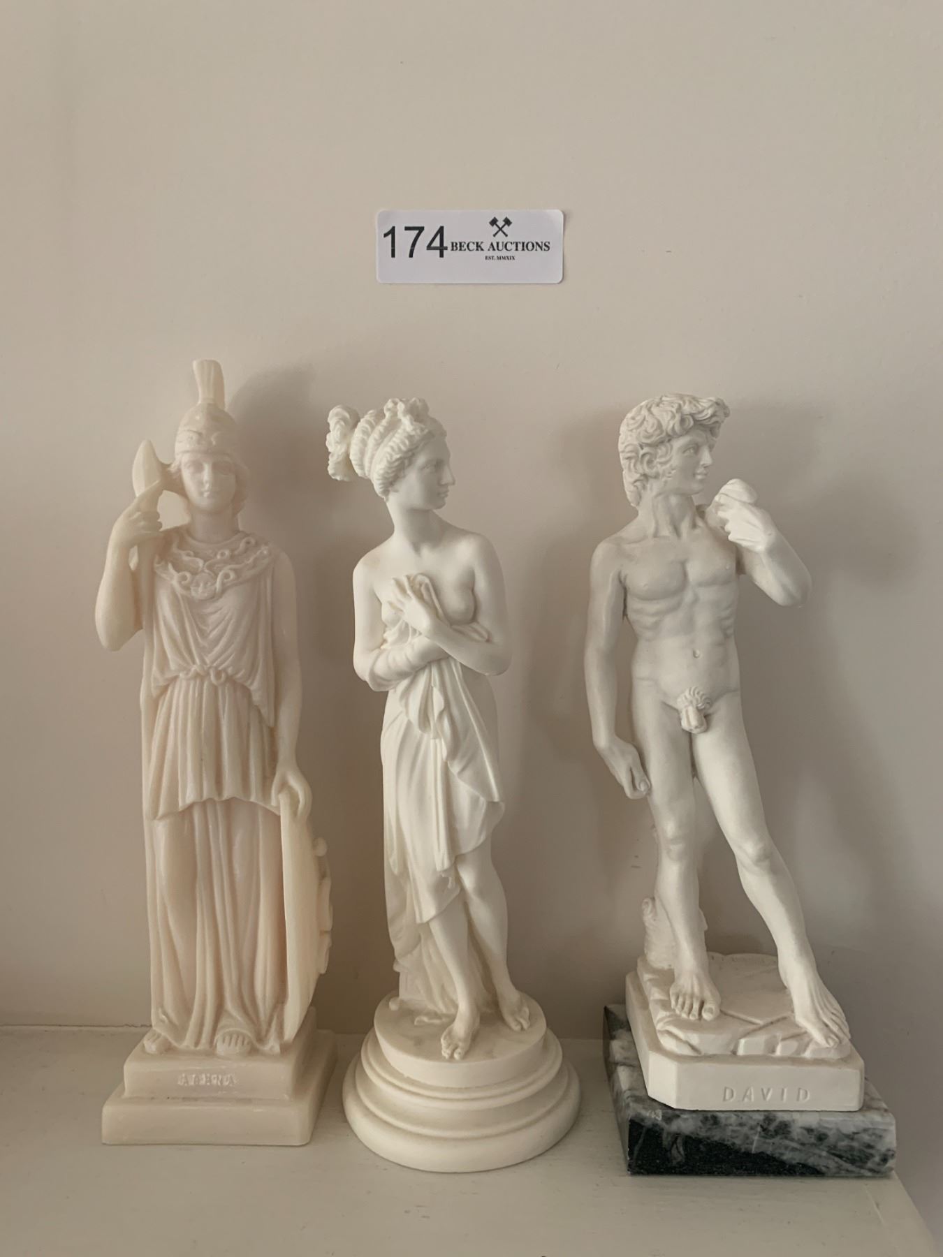 3 x Miniature Renaissance-Style Sculptures of Athena, Venus, and Michelangelo's David