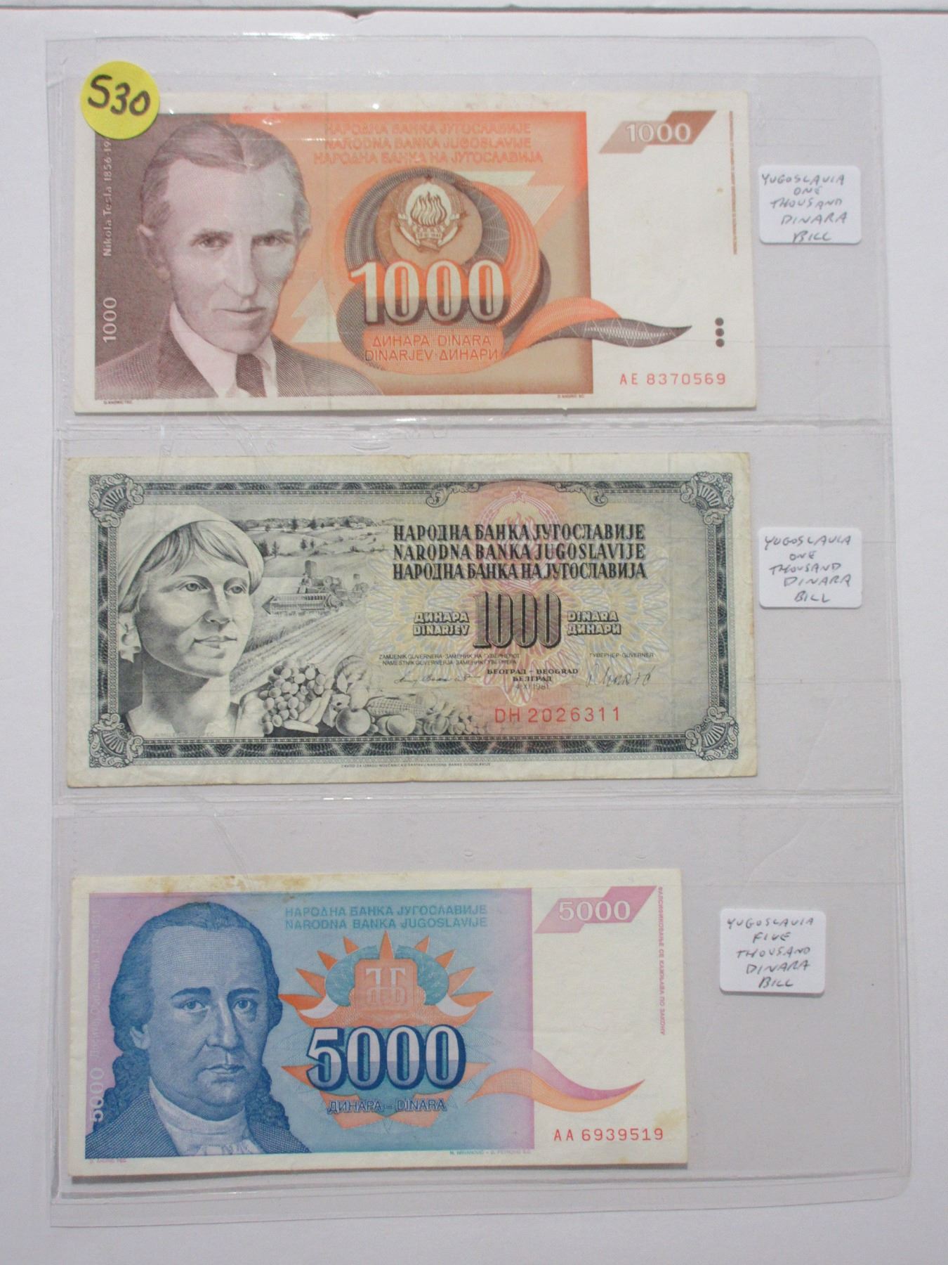 3- yugoslavia bills , 1,000 dinara bill & 1,000 dinara bill- ( both 1,000 bills are different bill patterns) & 5,000 dinara bill