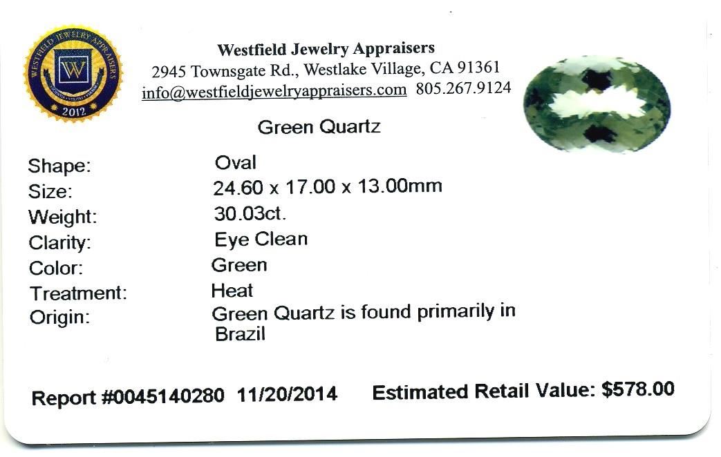 30.03ct. Oval Green Quartz Westfield Appraised at $578.00.