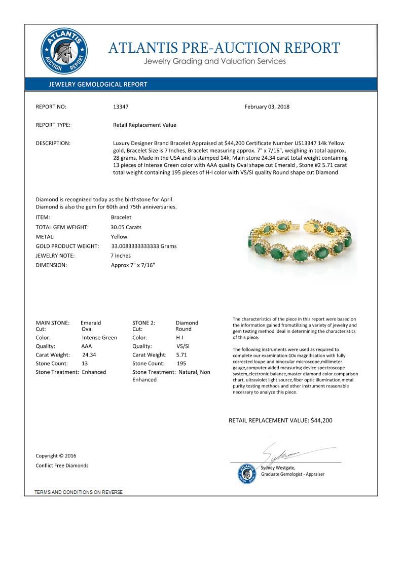 REF-618F2N -13347 ---- 30.05 CTW Emerald & Diamond Bracelet 14K Yellow Gold ---- Luxury Designer Brand Bracelet Appraised at $44,200 Certificate Number US13347 14k Yellow gold, Bracelet Size is 7 Inches, Bracelet measuring approx. 7" x 7/16", weighing in total approx. 28 grams. Made in the USA and is stamped 14k, Main stone 24.34 carat total weight containing 13 pieces of Intense Green color with AAA quality Oval shape cut Emerald , Stone #2 5.71 carat total weight containing 195 pieces of H-I color with VS/SI quality Round shape cut Diamond