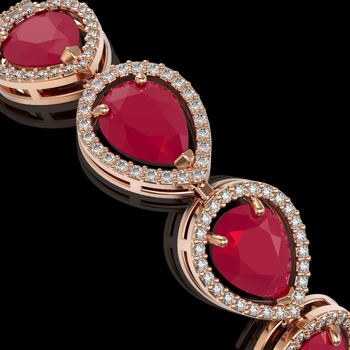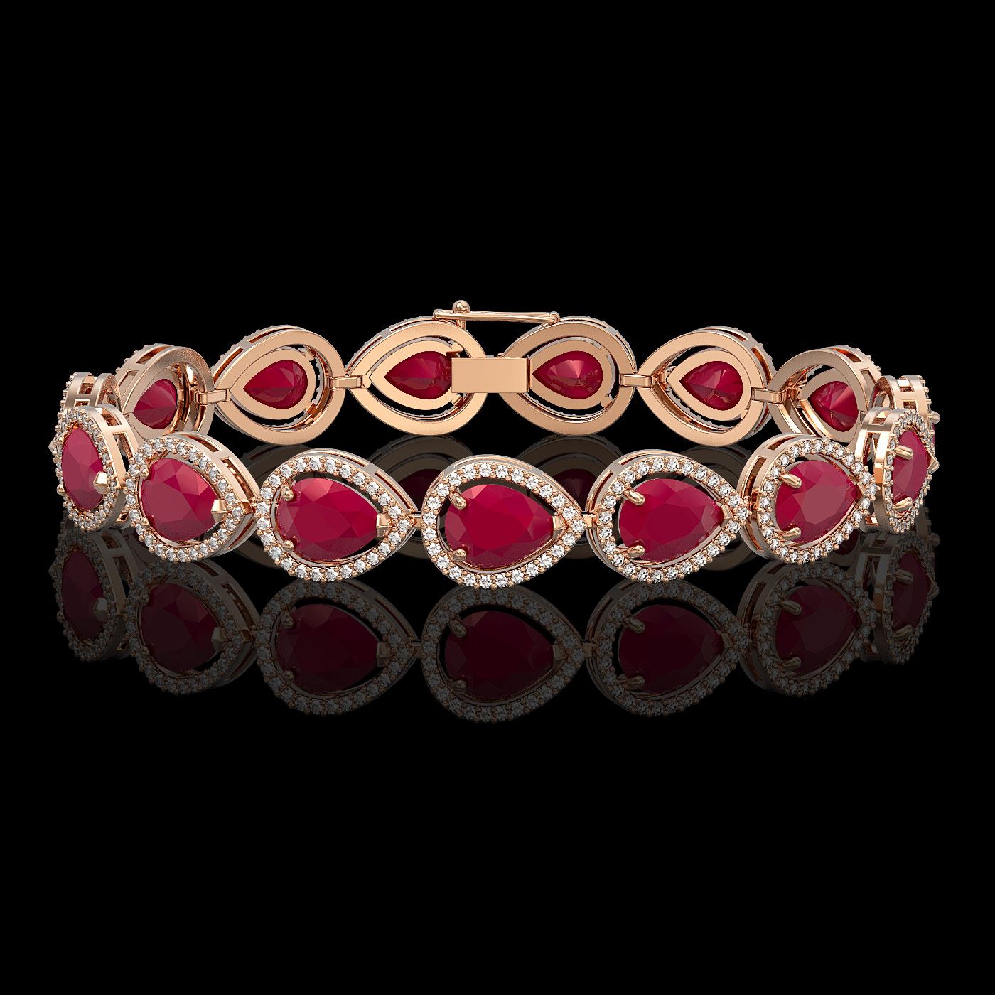 REF-368X5T -41238 ---- 30.06 CTW Ruby & Diamond Halo Bracelet 10K Rose Gold ---- Luxury Designer Brand Bracelet Appraised at $20,250 Certificate Number US41238 10k Rose gold, Bracelet Size is 7 Inches, Bracelet measuring approx. 10 mm x 7 Inches, weighing in total approx. 14.5 grams. Made in the USA and is stamped 10k, Main stone 27.01 carat total weight containing 15 pieces of Mid-Opaque-Deep Red color with AAA quality Pear shape cut Ruby , Stone #2 3.05 carat total weight containing 375 pieces of G-H color with VS/SI quality Round shape cut Diamond