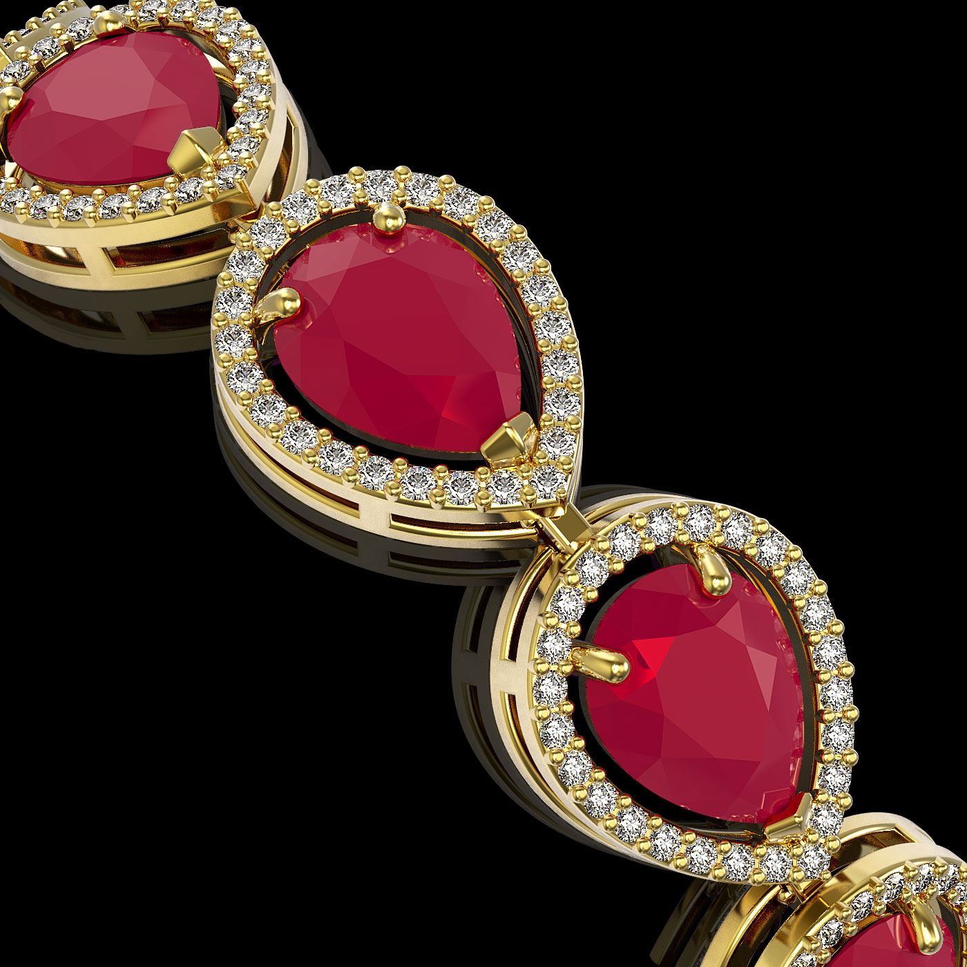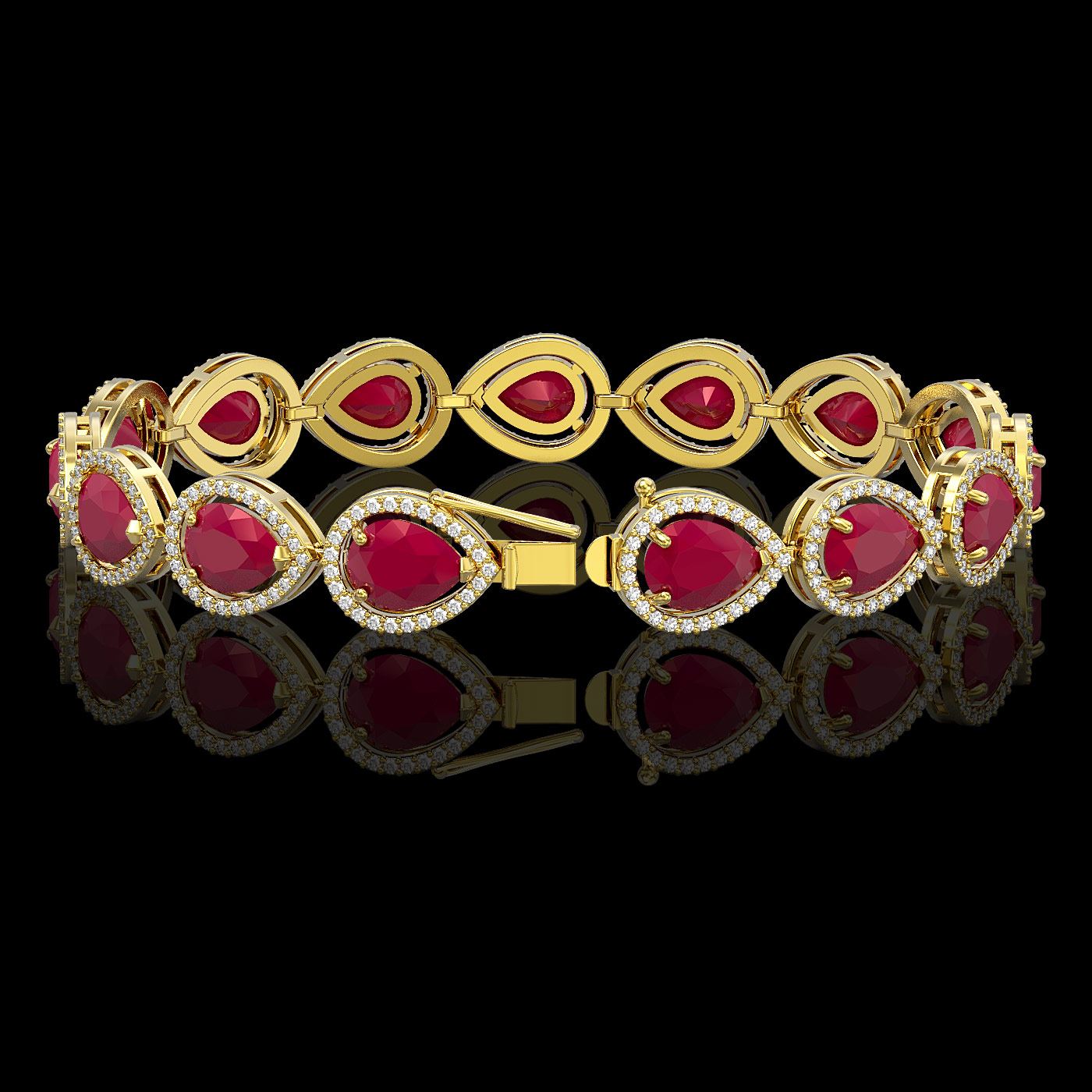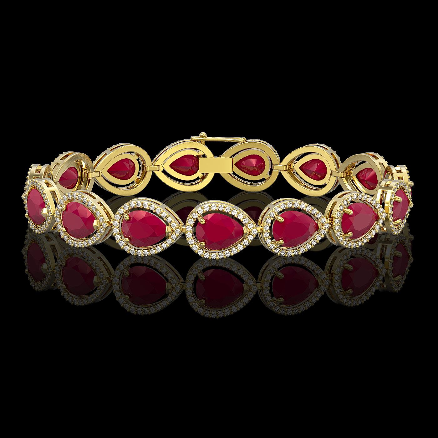 REF-368T5M -41239 ---- 30.06 CTW Ruby & Diamond Halo Bracelet 10K Yellow Gold ---- Luxury Designer Brand Bracelet Appraised at $20,250 Certificate Number US41239 10k Yellow gold, Bracelet Size is 7 Inches, Bracelet measuring approx. 10 mm x 7 Inches, weighing in total approx. 14.5 grams. Made in the USA and is stamped 10k, Main stone 27.01 carat total weight containing 15 pieces of Mid-Opaque-Deep Red color with AAA quality Pear shape cut Ruby , Stone #2 3.05 carat total weight containing 375 pieces of G-H color with VS/SI quality Round shape cut Diamond