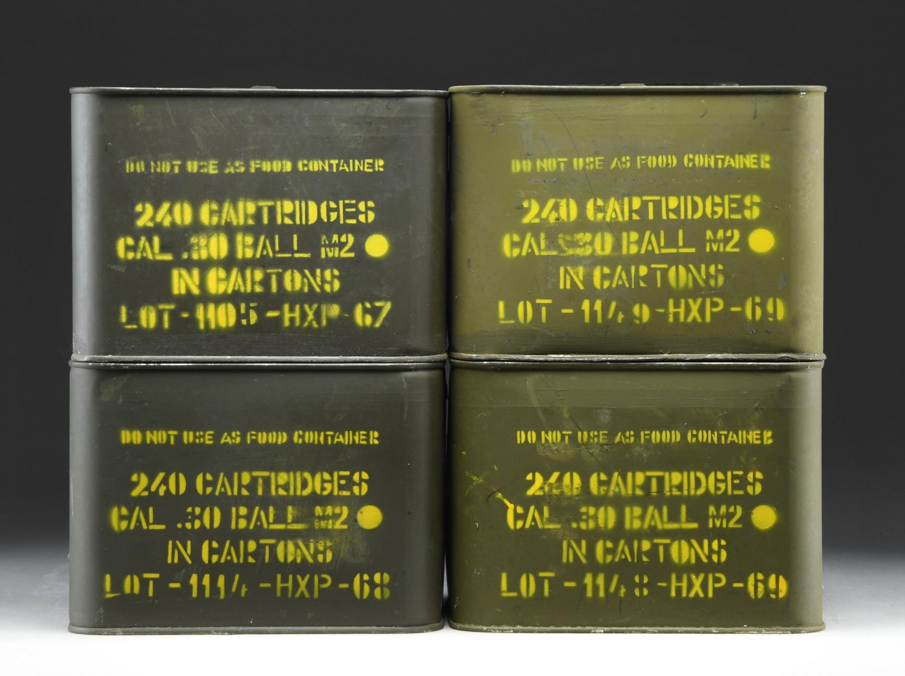 Greek manufacture produced in the late 1960's. The 4 sealed metal "spam cans" are complete with opening keys. The 4 cans are marked "240 cartridges cal. .30 ball M2 in cartons". CONDITION: cans are in very good condition, retaining nearly all original green paint w/ light handling wear. Markings are legible. Ammunition not inspected due to the sealed nature of the cans. (02-23752-3/RW). AMMO. $300-600.