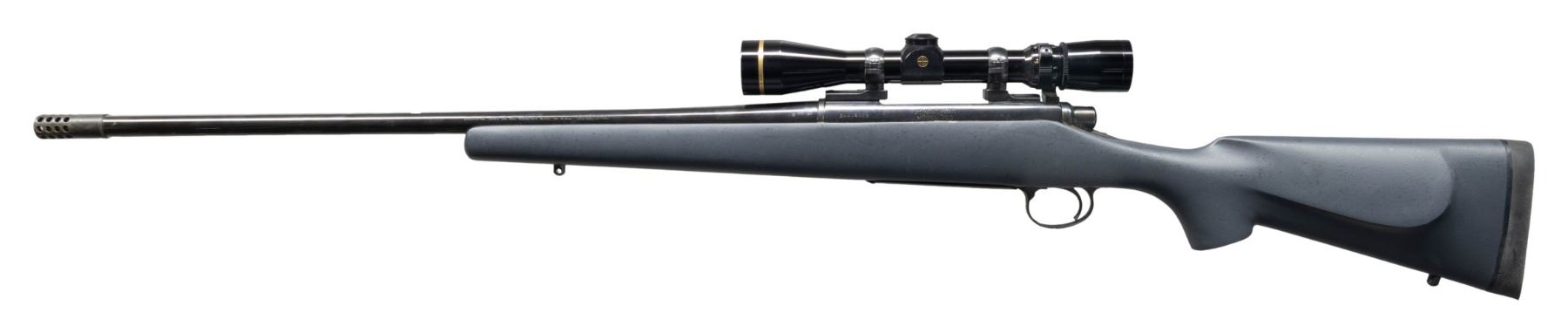LEUPOLD SCOPE. Cal. 30-06. S# B6404639. Bbl. 23.5" including ported muzzle brake. Leupold VARI-X III 2.5-8x duplex scope with Leupold 2 piece rings & bases. Matching numbered bolt. Black composite stock with Brown Precision pad. CONDITION: near excellent overall with light wear & finish loss on muzzle brake. Bore shows large area of fouling mid way with strong shiny rifling for balance. (25-3745/MD). MODERN. $400-600.