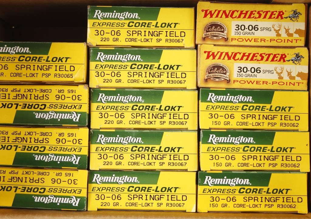 Box of 223 rounds of Remington ammo and 40 rounds of Winchester ammo. The Winchester is 150Gr Power Point Cabela's 50th Anniversary. The Remington has 60 rounds of 150Gr Core-Lokt, 91 rounds of 220Gr Core-Lokt, 60 rounds of 165 Gr Core-Lokt, 12 rounds of 180Gr Core-Lokt. 263 rounds total.