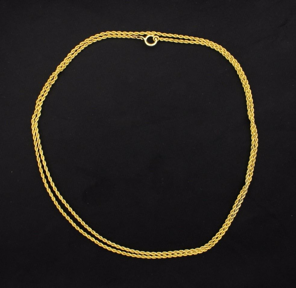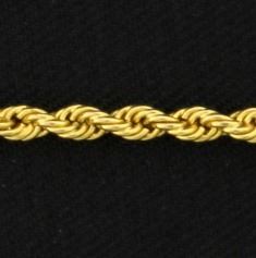 In 14K yellow gold this chain is 1.7mm wide and has a lobster clasp. 8.6g