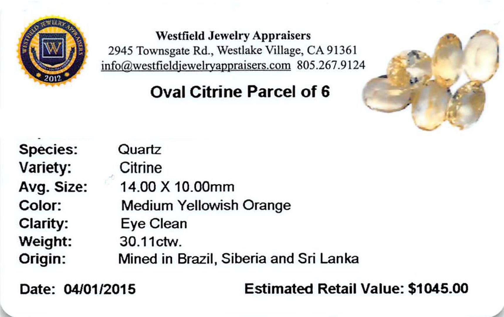 Six oval mixed cut natural citrine quartzs exact total weight 30.11ct., clarity is eye clean, type I, medium, slightly brownish, yellowish orange color, (GIA yO 5/2), cut is good. Westfield Appraised at $1,045.00.