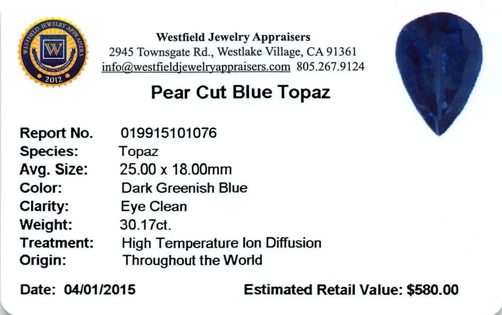 One pear cut natural blue topaz exact weight 30.17ct., clarity is eye clean, type I, dark, very slightly grayish, greenish blue color, (GIA gB 7/3), cut is good. Westfield Appraised at $580.00.